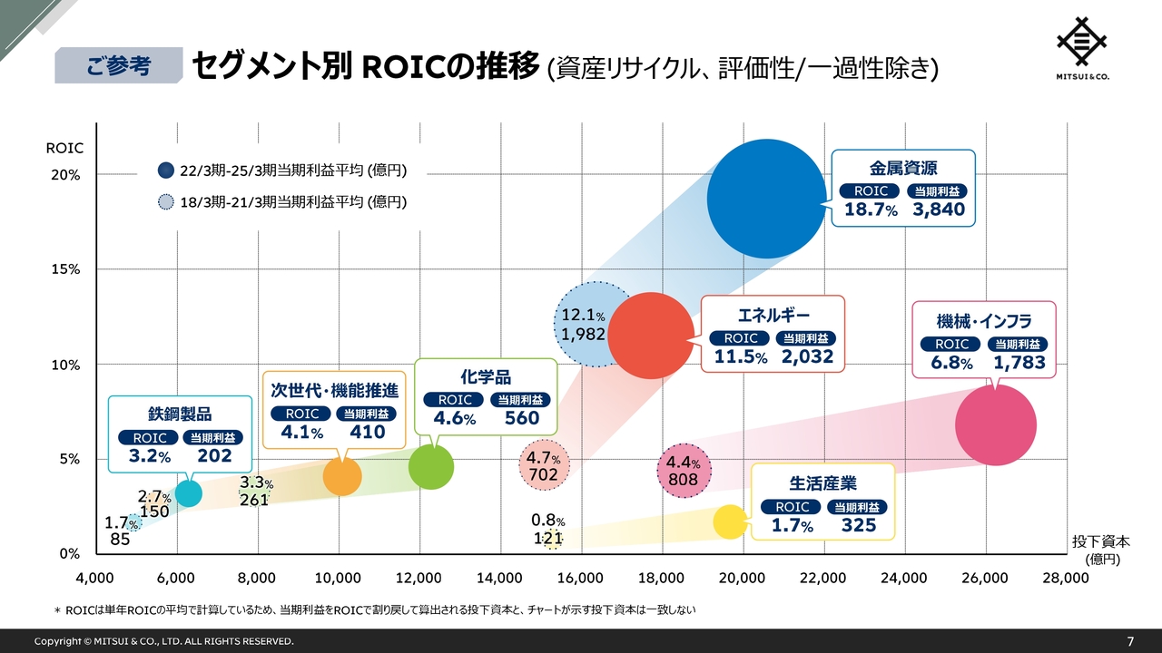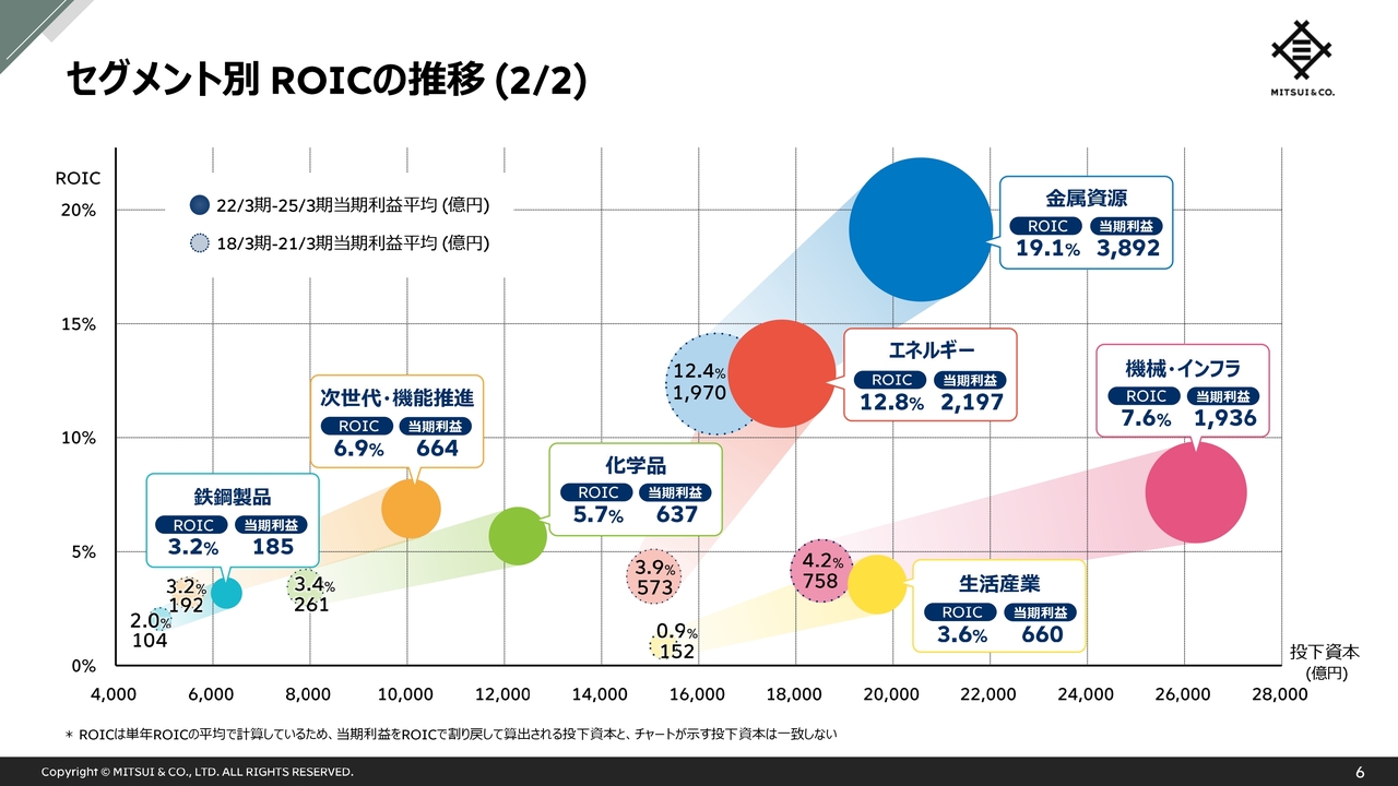 金属資源・エネルギーセグメントのボラティリティについてご指摘をいただくこともありますが、強いものをより強くしたというのは、単に投資額を増やしたということではありません。コストカーブを意識しながら、競争力の高い権益を取得し、物流、トレーディングの収益拡大と事業ポートフォリオの入替・良質化に取り組んできました。その結果として、単年ごとの外部環境の変化に左右されないよう平均でお示ししたバブルチャートでも右上に切り上がっています。エネルギートランジションでの取組みも進めており、中長期的なスパンで、まだまだROICの水準を切り上げていく余地があると考えています。