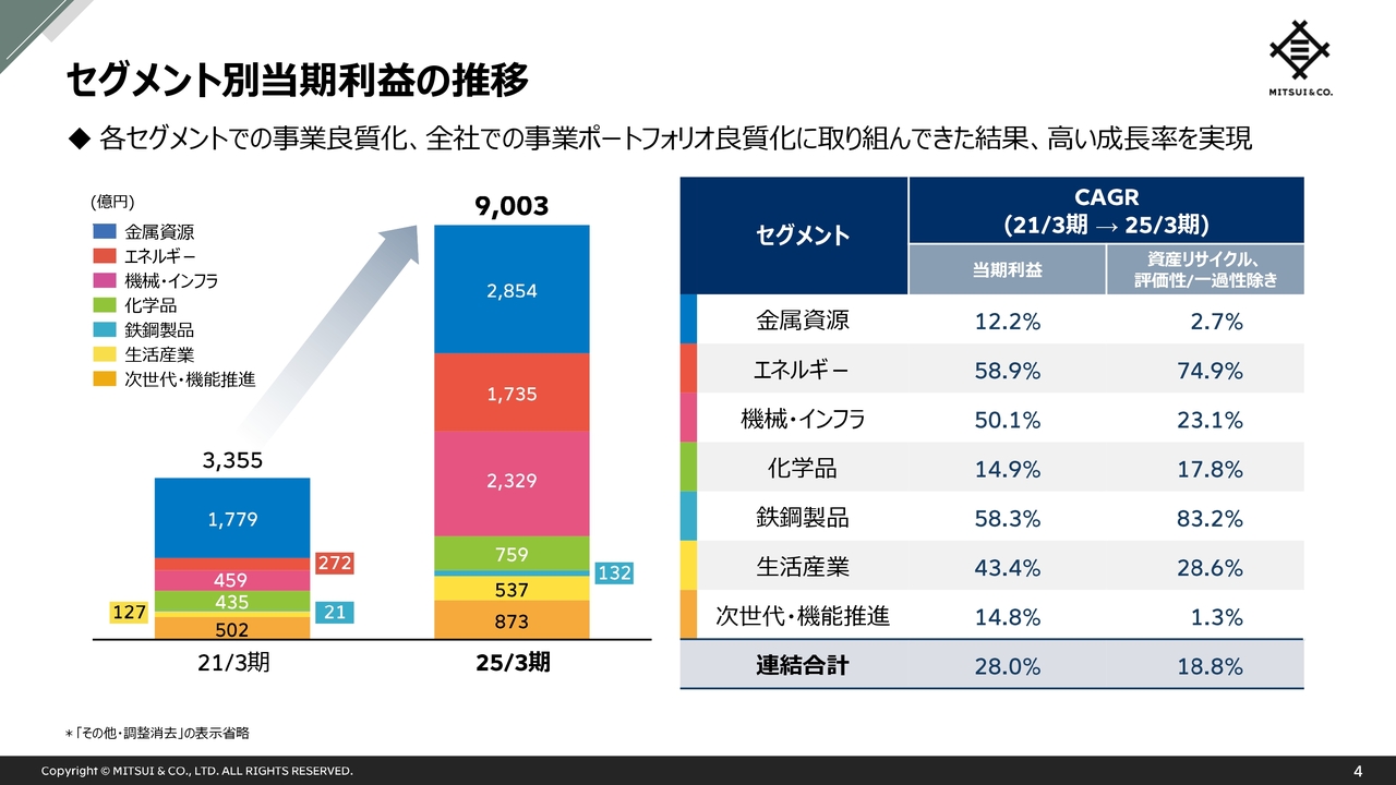 当期利益について、セグメント別での推移をご説明します。スライド左側の図では2021年3月期と2025年3月期のセグメント別当期利益を示しており、右側の表では同期間における各セグメントの年平均成長率を表しています。ミドルゲームの徹底による既存事業の強化に加えて、戦略的な資産リサイクルを実行している機械・インフラセグメントや、LNGをはじめとする物流と投資を組み合わせた事業ポートフォリオをもつエネルギーセグメントで、利益規模を伴う高い成長率を実現しています。