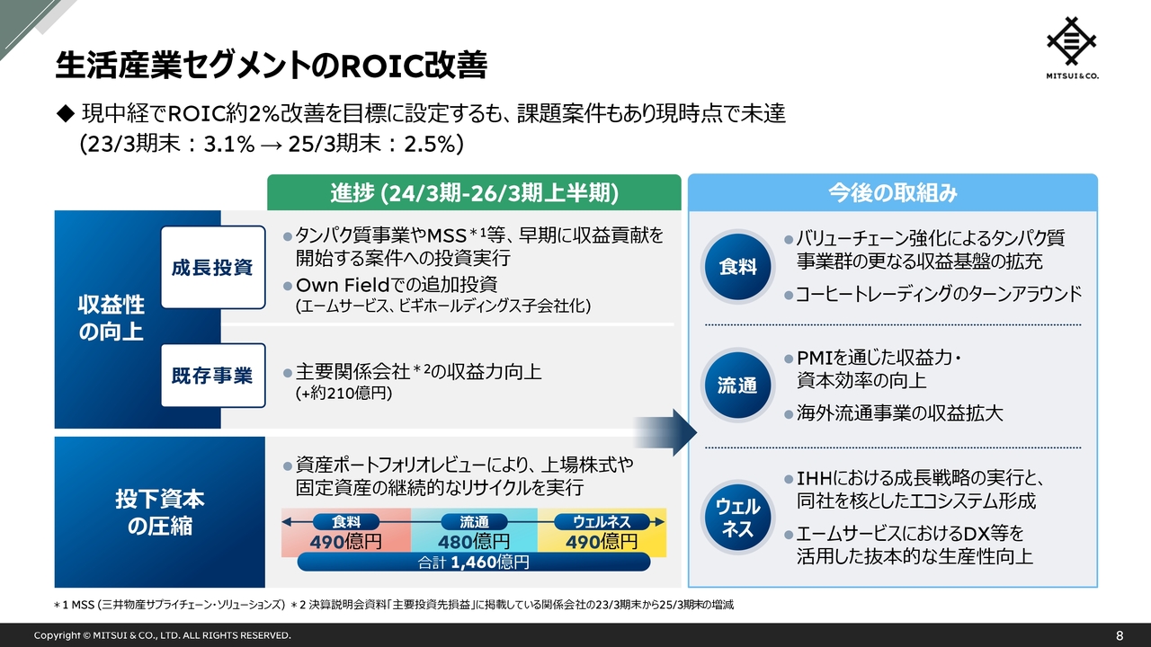 お示ししたROICは平均を使っており、相応に実力を表していますが、現中経ではコーヒートレーディングの苦戦がありました。また、優良なコア事業に育っていくことを確信しているタンパク質事業でも、当初計画どおりの収益貢献ができていない案件もあることが、生活産業セグメントのROICが低い要因の1つと考えます。