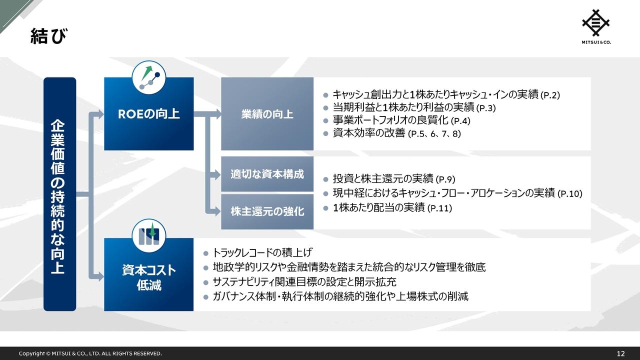 本日お話ししたROICの向上はROEの向上に直結するものです。現中経期間も残り3ヶ月余りとなりましたが、定量目標であるROE3年平均12パーセント超の目標を少しでも超過達成できるよう全社一丸となって取り組みます。