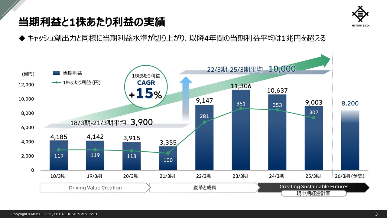 当期利益についても、1株あたり利益は先のキャッシュ・インのスライドと同様の傾向・推移を示しており、直近4年平均の当期利益は1兆円を超え、1株あたり利益は過去8年間に年率15パーセントで成長しています。