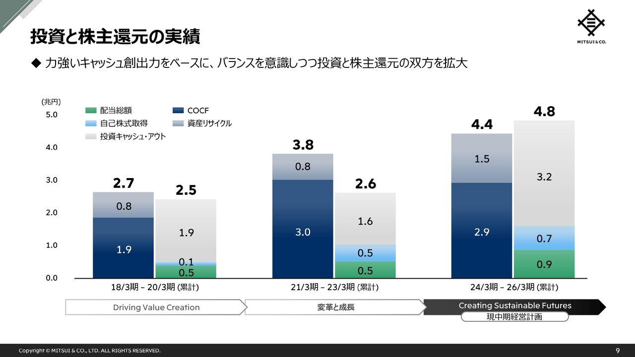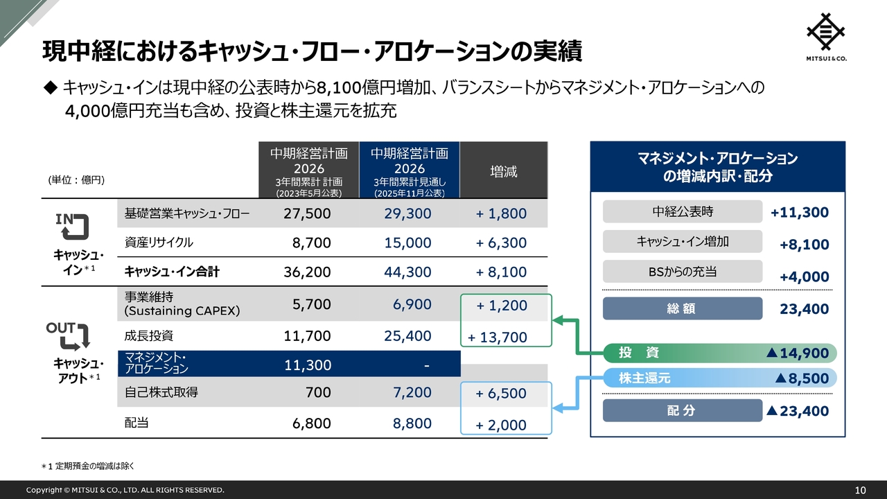 さまざまな取組みの結果、当社の基礎営業キャッシュ・フローは現中経公表時の2兆7,500億円から2兆9,300億円に、資産リサイクルも8,700億円から1兆5,000億円に増加し、キャッシュ・イン合計は8,100億円拡大する見込みです。これに加え、Rhodes Ridge鉄鉱石事業の権益取得にあたってはバランスシートから4,000億円のマネジメント・アロケーションへの充当を実行し、厳選した成長投資と株主還元の拡大を両立させました。