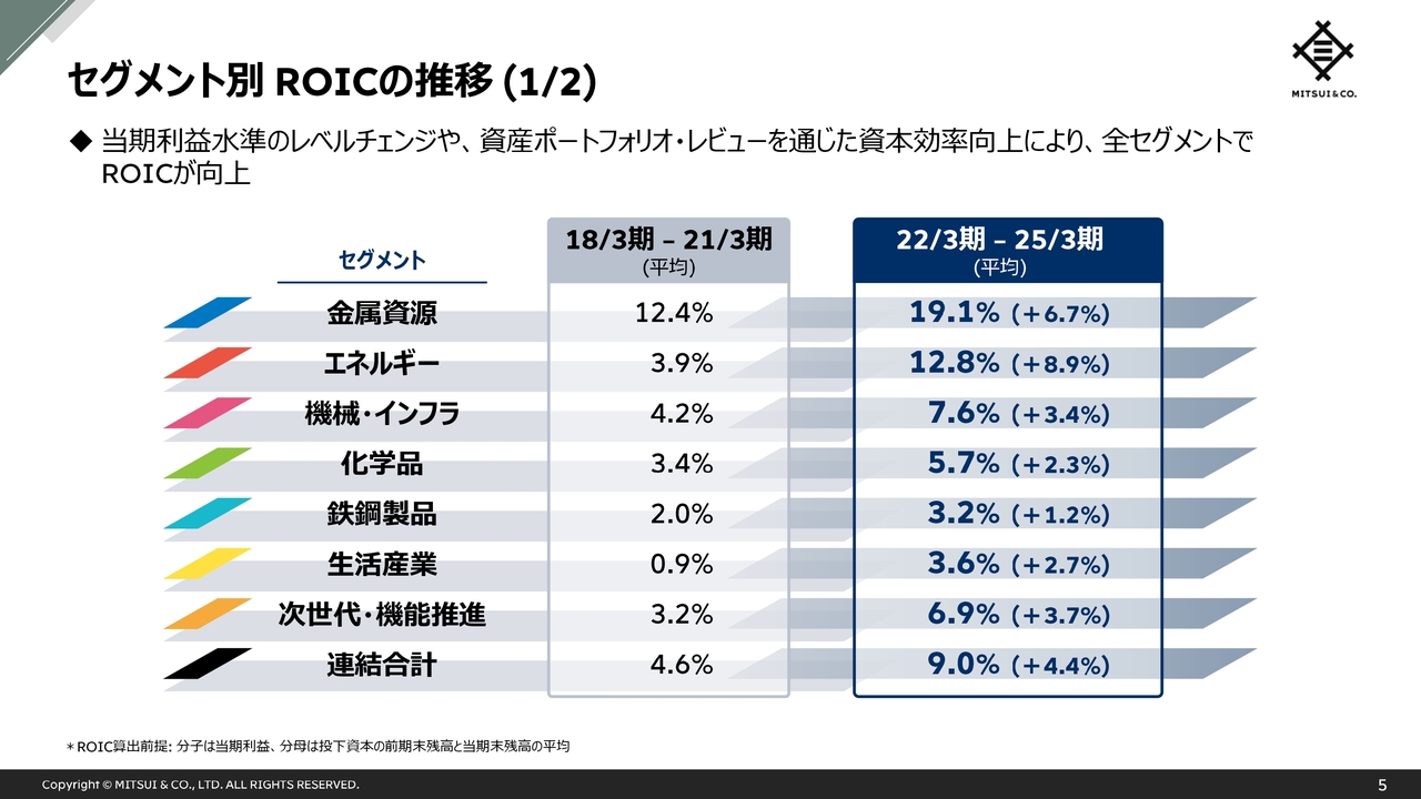 質問者:スライド7を見ると、全セグメントが右上を向いていて改善方向にはあるものの、大きく改善したのが金属資源・エネルギーセグメントで、全社のROIC改善を牽引したとも読み取れます。これが必ずしも悪いことだとは思いませんが、両セグメントの業績は外部環境に影響される側面も強いと思います。この点についてどのように評価しているか教えてください。