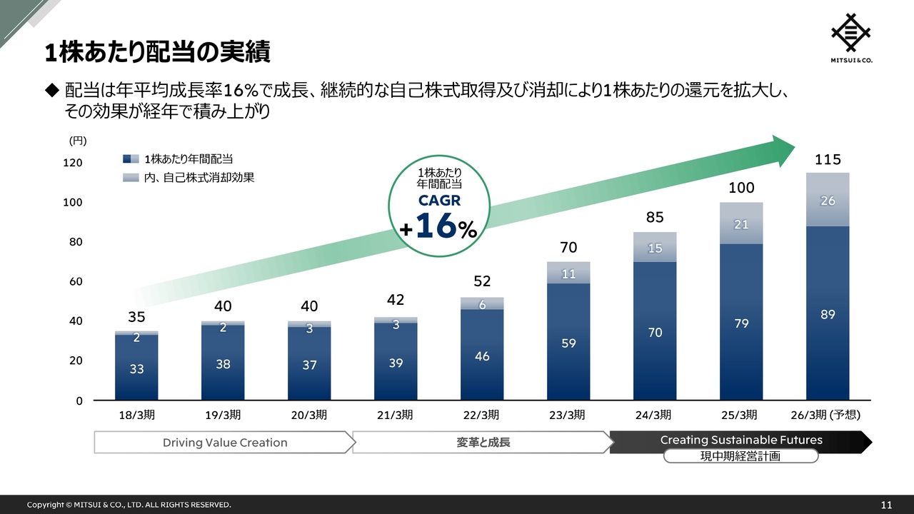 配当は2018年3月期から1株あたりの年間配当金額は年率16パーセントで成長しており、さらに現中経以降も累進配当を継続する方針を決定しました。
