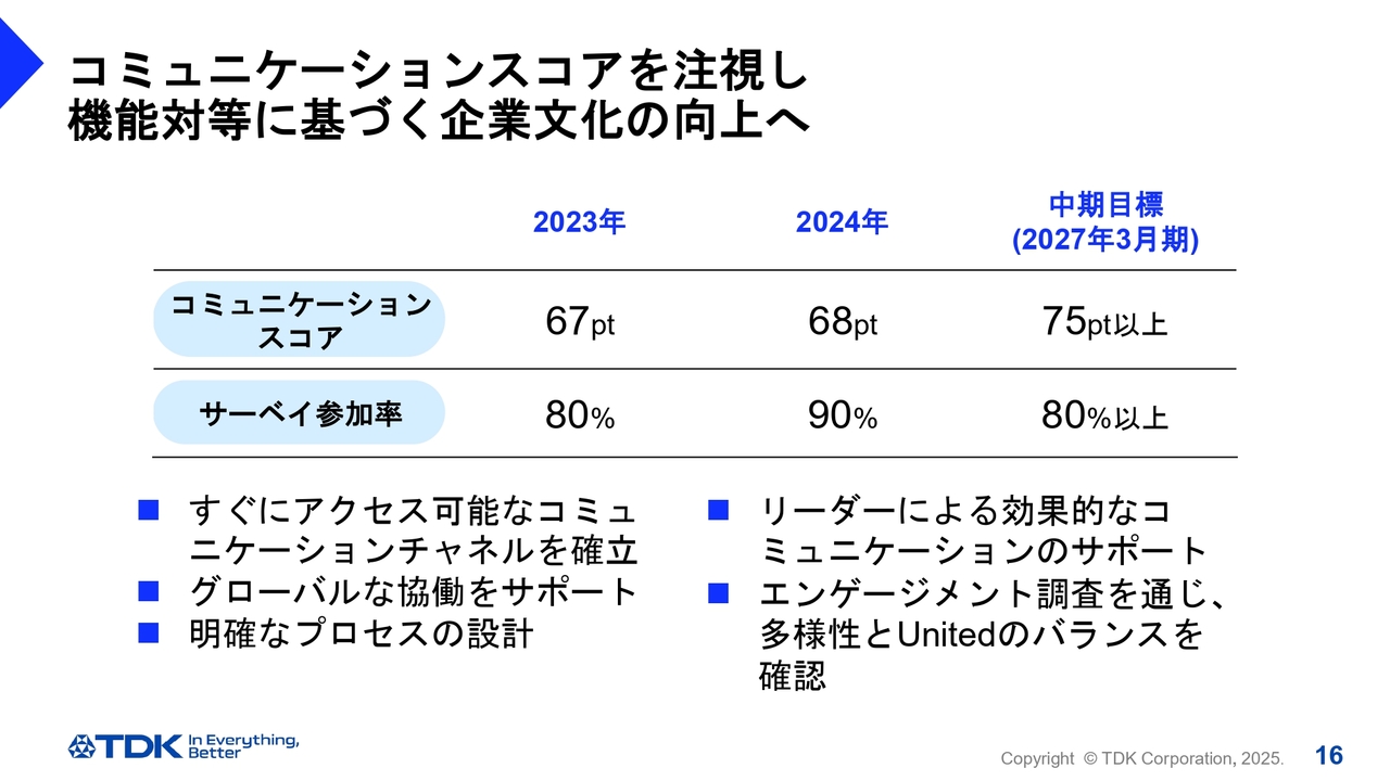 このエンゲージメント調査では、世界各地のチームメンバーからフィードバックを受け取りますので、施策の微調整を行うとともに、チームメンバーのコミュニケーションや協働を向上させ、TDKの価値創造につなげています。