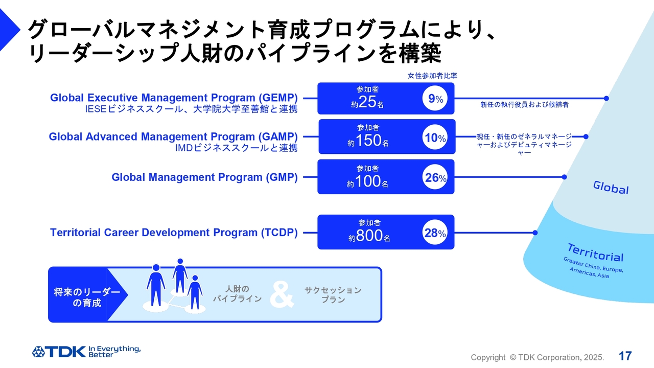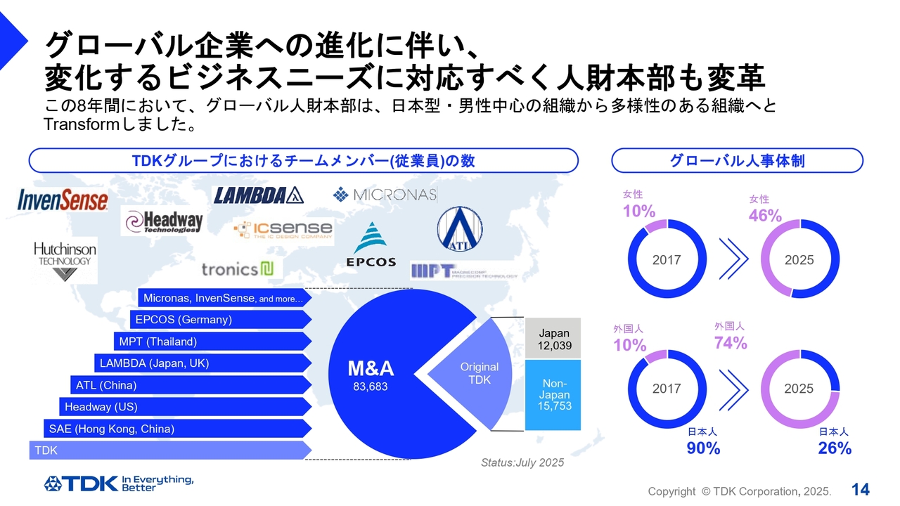 日本人と外国人の割合についても、2017年には10パーセントでしたが、現在では74パーセントになっています。これらは大きな変化であり、現在のTDKの現状を如実に表しています。
