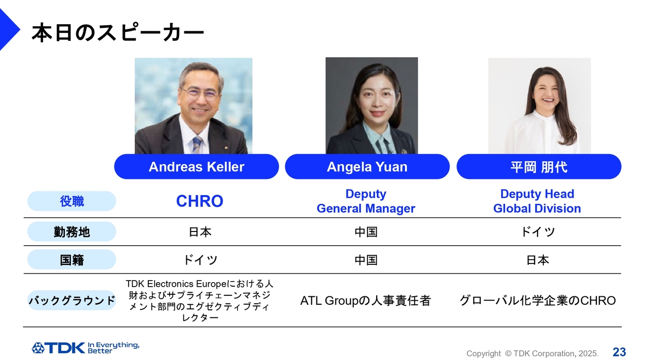 1人目のAngela Yuan(アンジェラ・ユエン)さんは、人財本部の副本部長で、もともとはTDKのグループ会社で、香港に拠点を置くATL社の人事責任者でした。2人目の平岡朋代さんはグローバル人財開発統括部の副統括部長であり、ドイツのミュンヘンに駐在しています。以前は、グローバルな化学企業でCHROを務めていました。