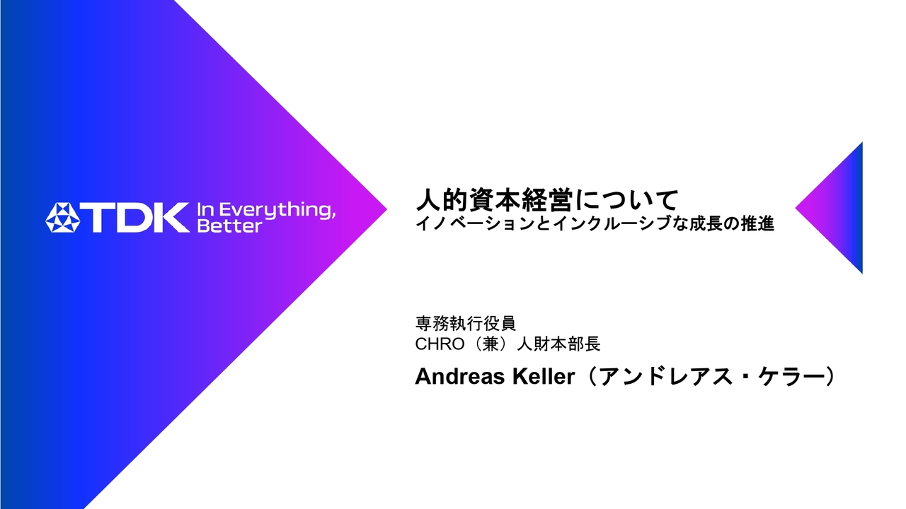 アンドレアス・ケラー氏(以下、ケラー):みなさま、こんにちは。本日はTDKの人事戦略についてお話しさせていただくことを非常に光栄に思います。「イノベーションとインクルーシブな成長の推進」と題して、TDKの成長についてお話しします。