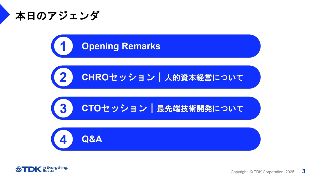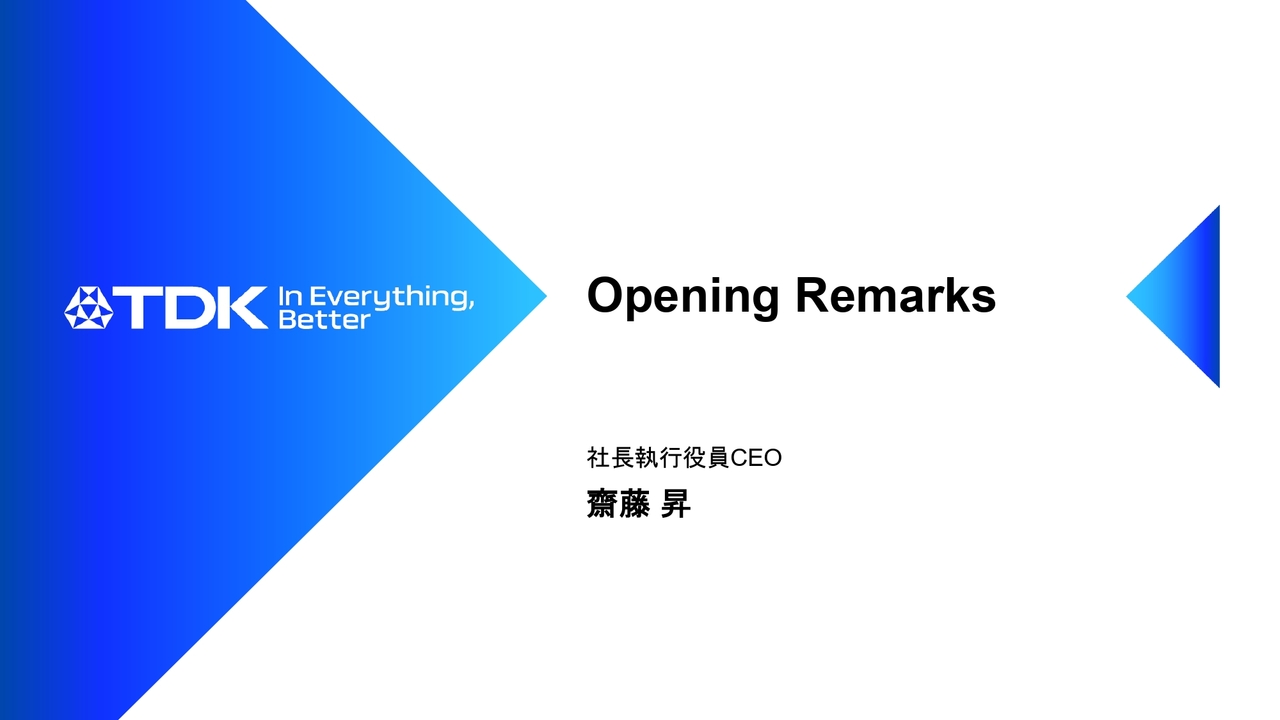 齋藤昇氏(以下、齋藤):みなさま、こんにちは。本日は大変蒸し暑い中、お集まりいただきありがとうございます。社長執行役員CEOの齋藤です。これより「TDK Investor Day 2025 未財務資本を通じた企業価値向上に向けて」を開催します。