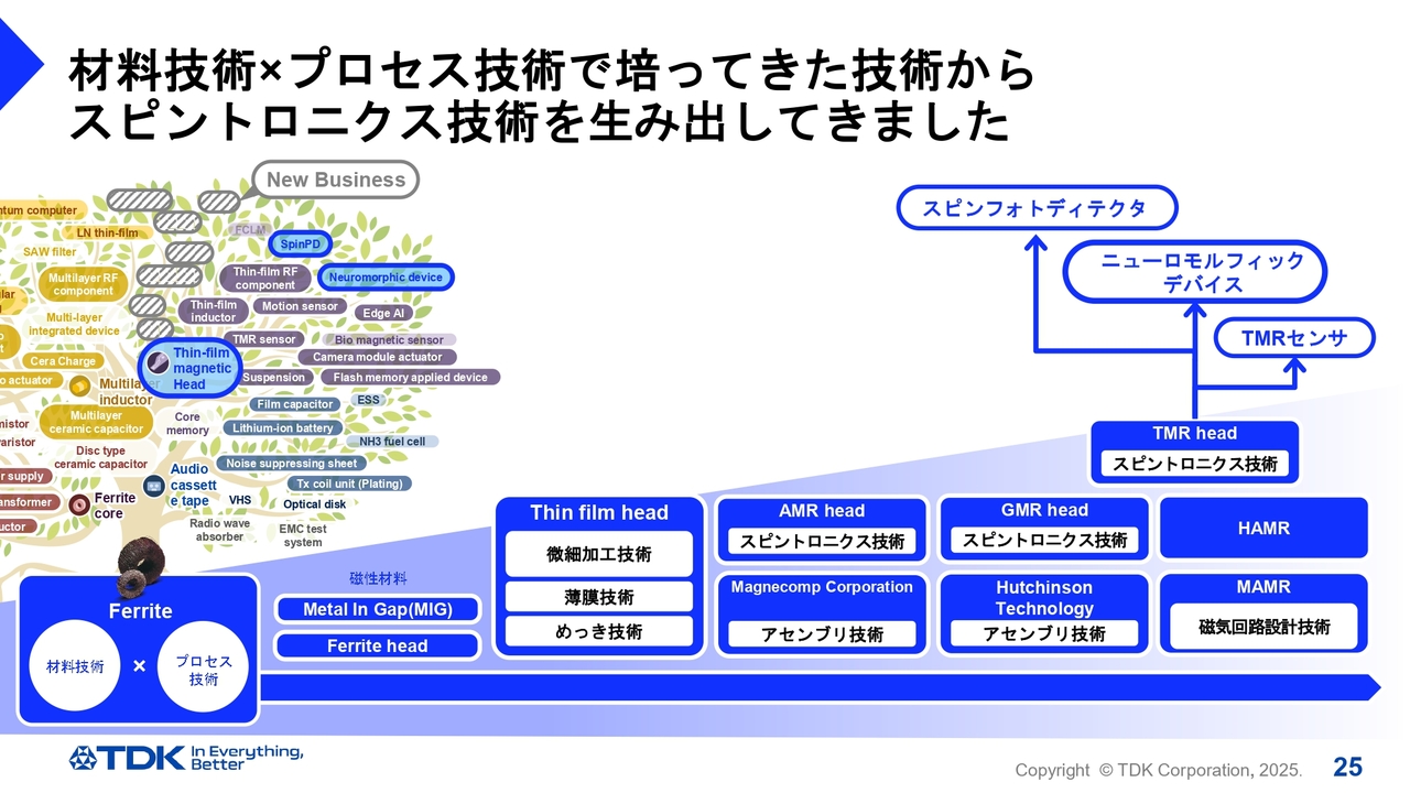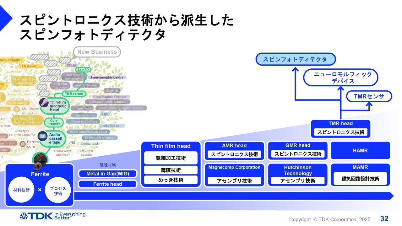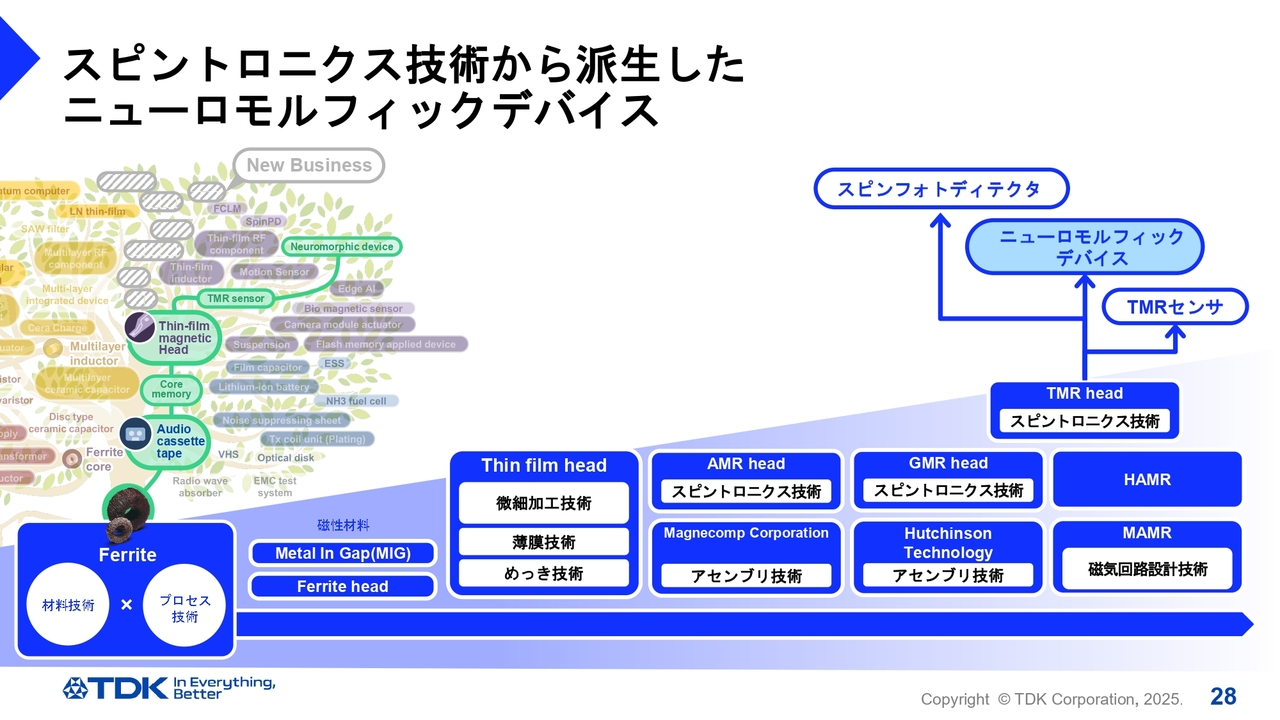 フェライトツリーのコアが分岐する前は同じところにいた両社が、まったく異なる方向にTransformationを遂げた点は非常に特徴的だと思います。フェライトツリーが分岐して大きくなるにしたがって、TDKは多くの技術を習得しながらスピントロニクスまでたどり着きましたが、非常にすばらしい可能性を秘めていると思います。