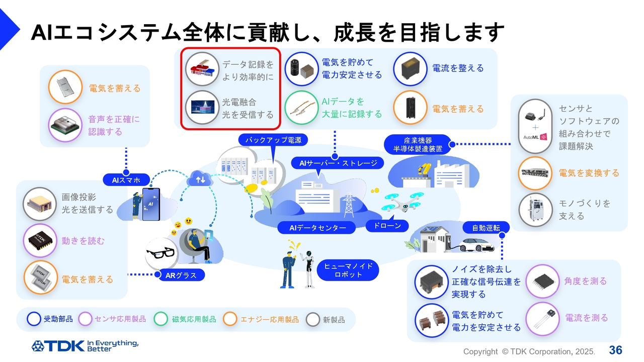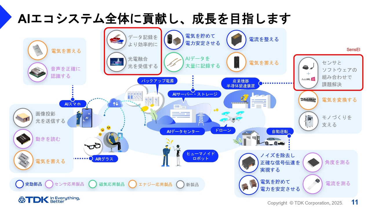 長期ビジョン「TDK Transformation」を加速させる、新しいTDKの姿はいかがでしたか? スマートフォンやEV、産業機器からAIエコシステムに至るまで、世界のあらゆる場所、見えないところで当社の技術が活躍しています。