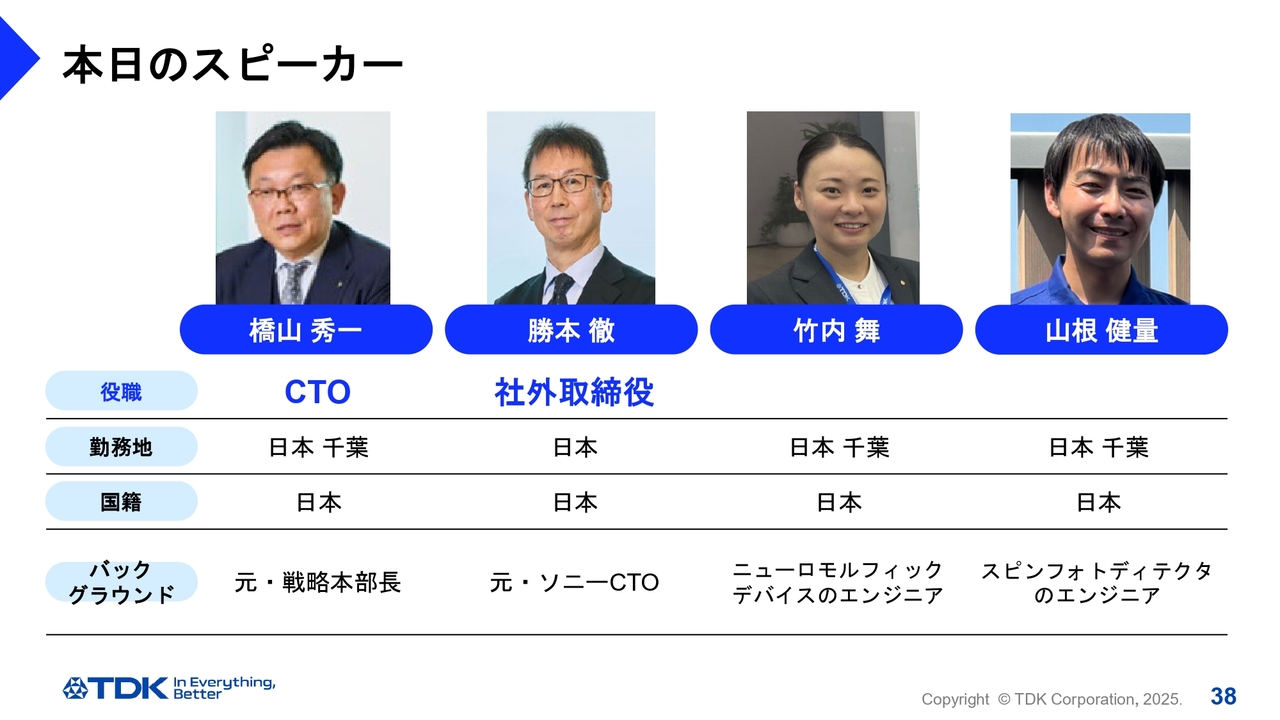 TDKの多様性を最大限に活かすために、私を含めて5人の主要なメンバーがいます。彼らは非常に多様な背景を持ち、日本、米国、中国、そしてドイツ出身のメンバーで構成されています。そして、そのうち2人が本日のパネルディスカッションに出席します。