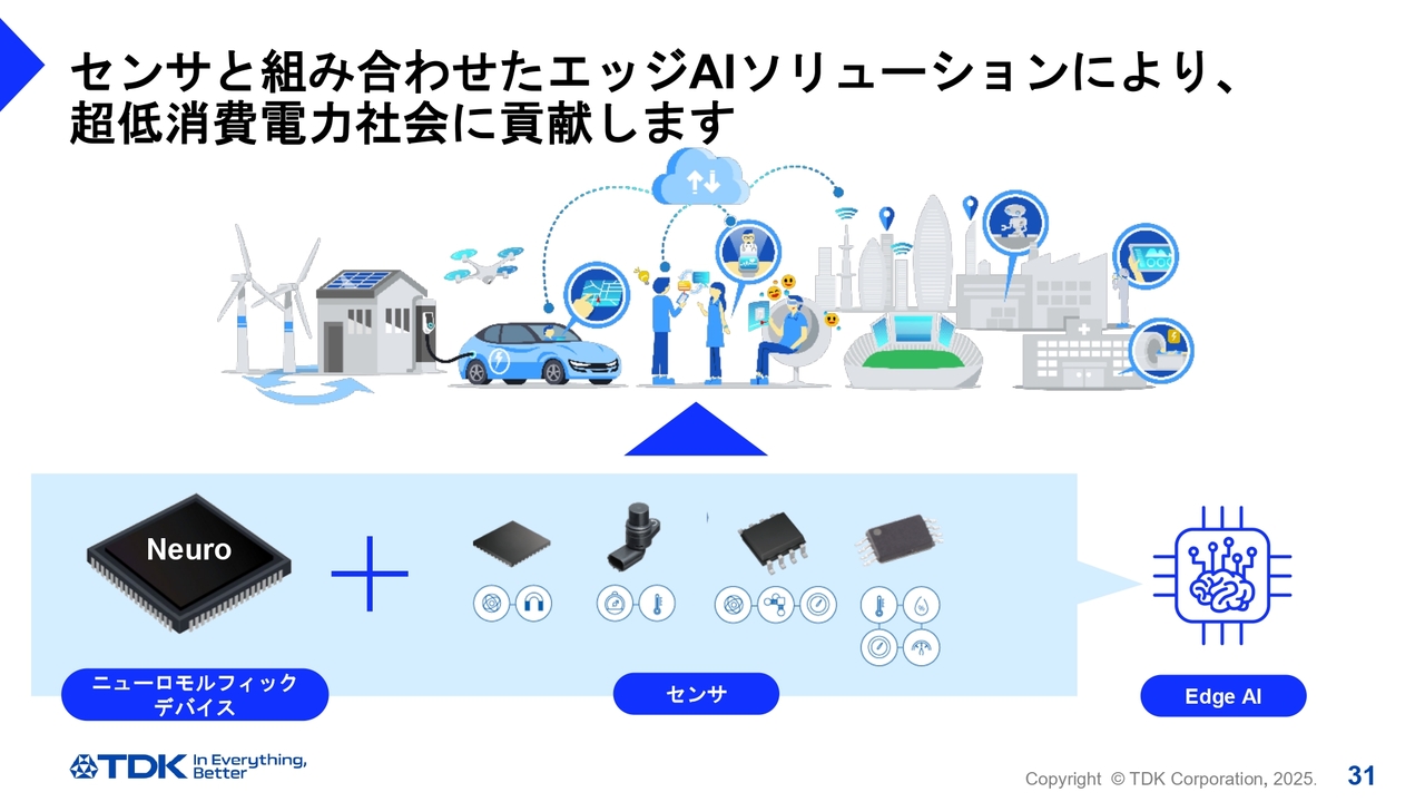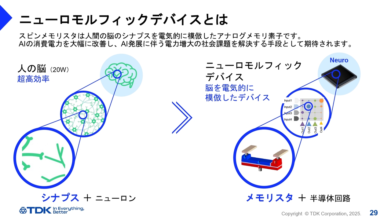 竹内舞氏(以下、竹内):このニューロモルフィックデバイスは、AIを活用する場面であればどこでも応用可能なものです。私たちは、消費電力が小さいという特徴に加え、「TDK United」でセンサ事業との組み合わせによって、エッジデバイスでの活用を想定しています。