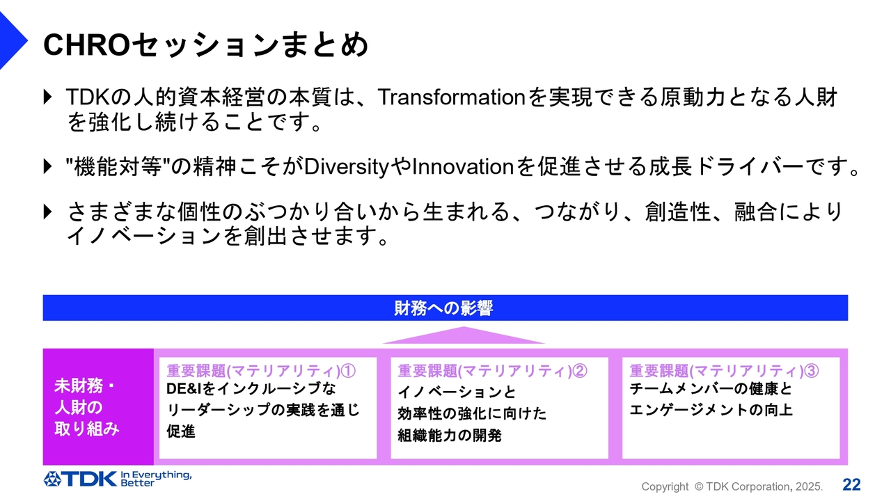 CHROのセッションまとめです。TDKの人的資本経営は、人財のTransformationにより、TDKのTransformationを加速させることです。機能対等の精神こそが、ダイバーシティやイノベーションを促進させる成長ドライバーであり、TDK Venture Spiritを育成するものです。