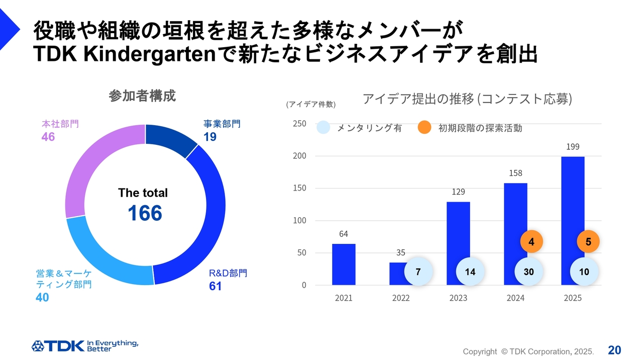 スライド左の円グラフは、「TDK Kindergarten」の参加者構成を示しています。参加者は非常に多様で、多岐にわたっています。例えば、研究開発部門の方だけでなく、いわゆる起業家精神を持つメンバーも参加して貢献できる仕組みです。