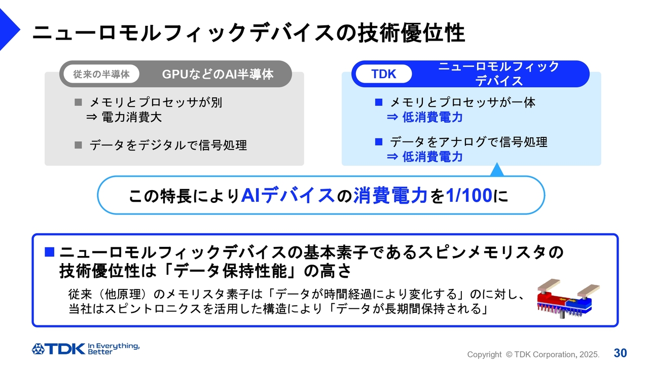 ニューロモルフィックデバイスを既存のAI半導体と比較すると、消費電力を2桁小さく、つまり100分の1に抑えることができます。