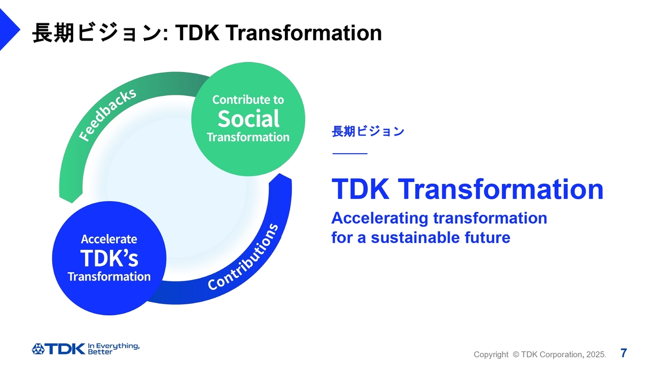 持続的な企業価値の向上を目指すため、昨年度から長期ビジョン「TDK Transformation」を掲げています。