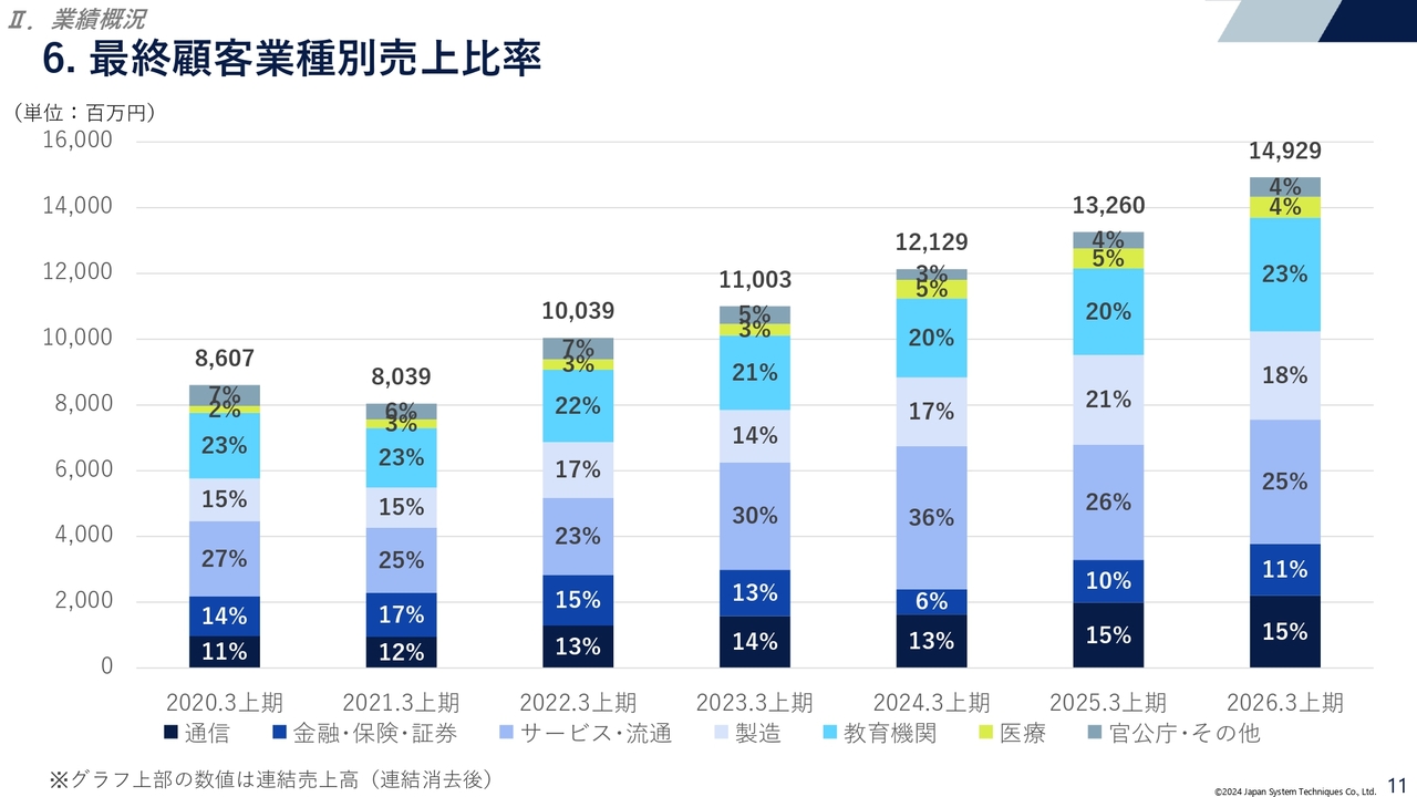 最終顧客の業種別の売上比率です。当社は、多種多様な業界・業種にシステムを導入していますので、スライドの棒グラフに記載の区分けとなっています。進行年度によっていろいろな案件があるため、比率が変わったところで何か大きな事象が隠れているということではありません。