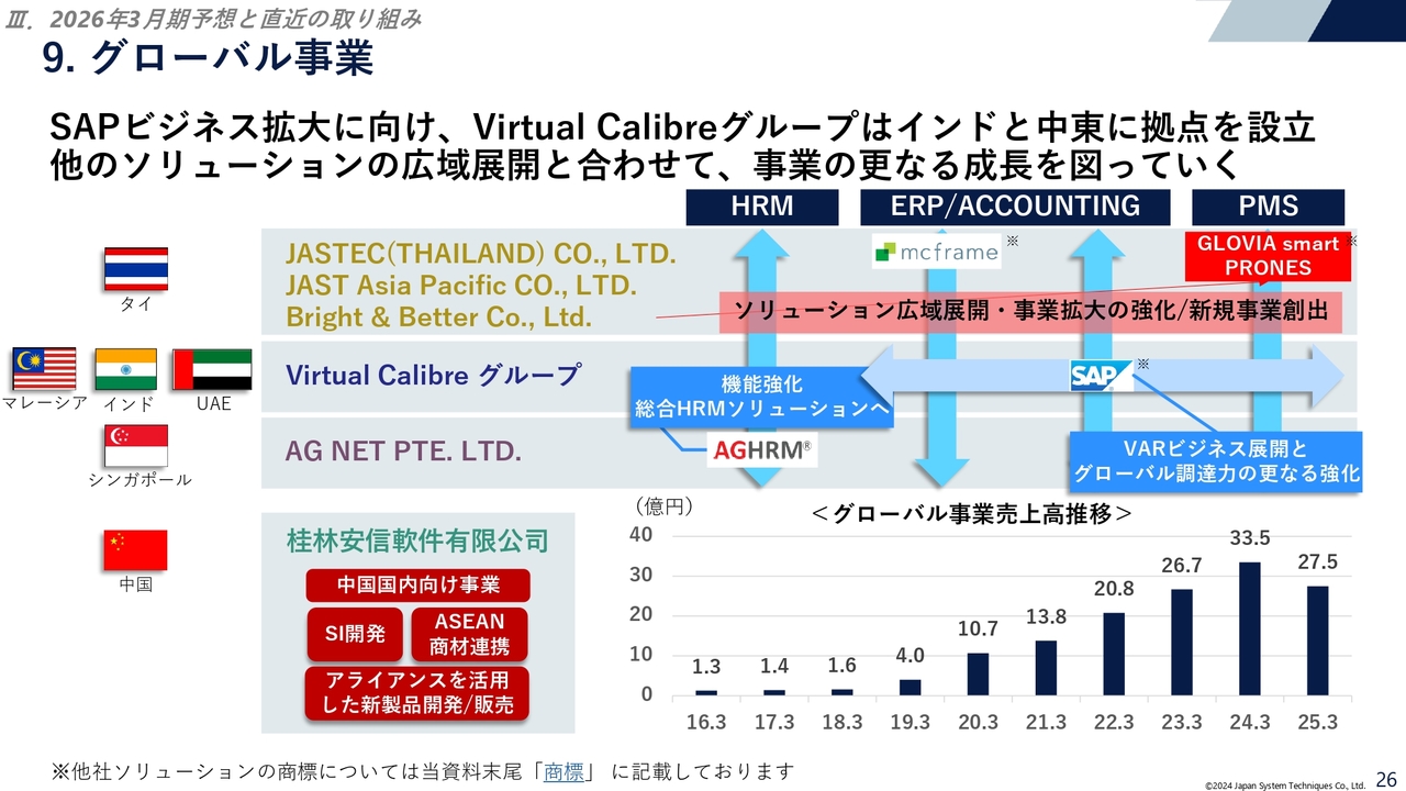グローバル事業です。マレーシアのVirtual Calibre社がグローバル事業のけん引役であることには、変わりありません。直近の1年から2年、同社は低調に推移しており、グローバル事業の今後を左右する非常に大きな課題であると当社も捉えています。