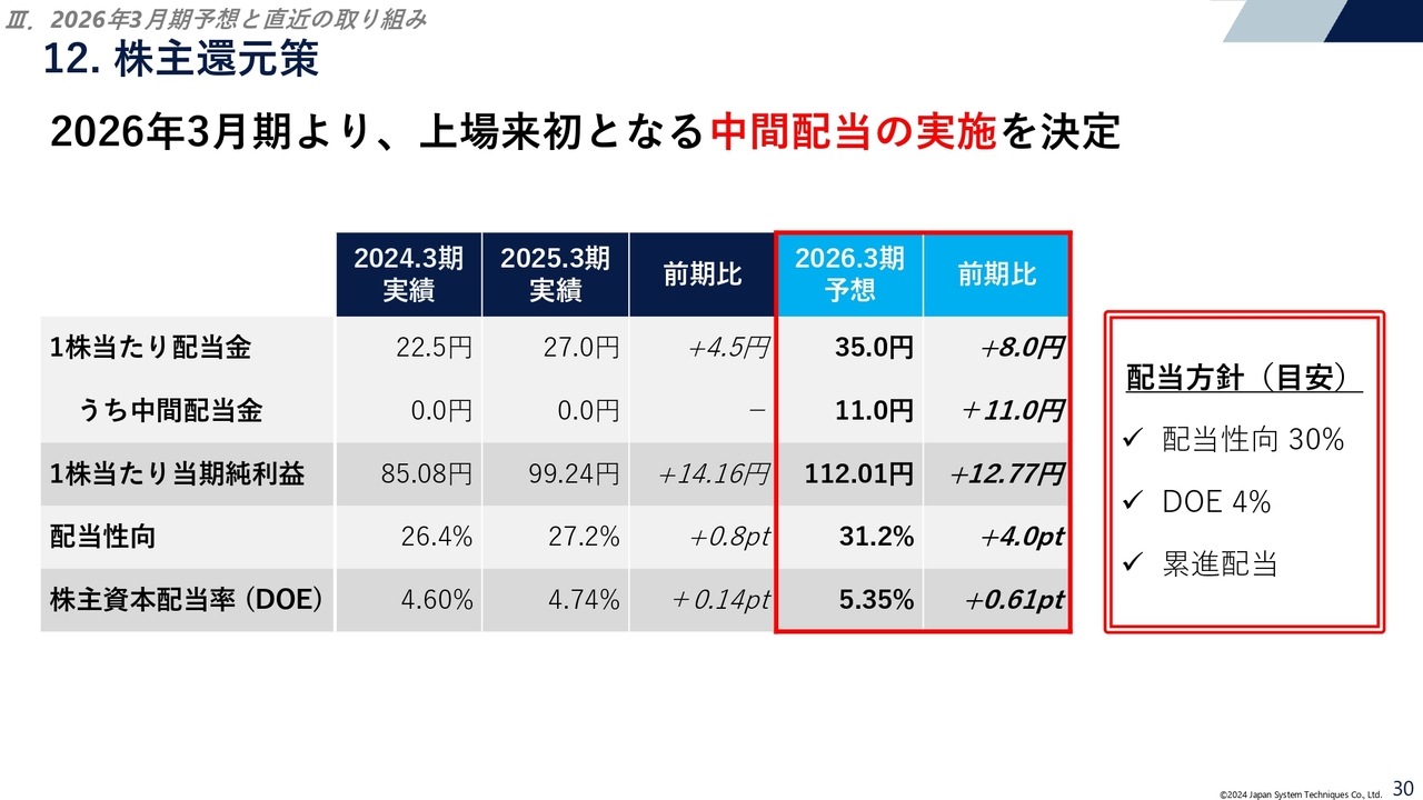 さらに、DOE4パーセントと累進配当を目指していきますが、今のところ業績予想値はリリースした数値から変更していませんので、期末配当は24円を予定しています。こちらは業績の状況に応じて、引き続き検討していきます。
