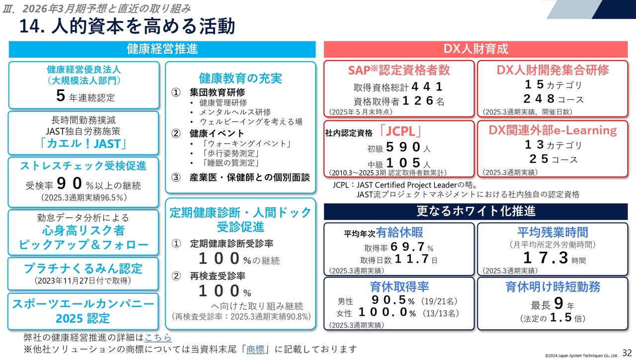 人的資本を高める活動についても、期末の資料とほぼ同様の内容です。健康経営優良法人は5年連続認定となり、引き続き認定していただけるように努めています。さらに定期健康診断・人間ドックは受診率100パーセントを維持しています。