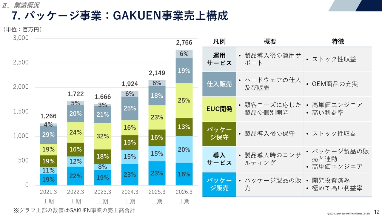 パッケージ事業の中のGAKUEN事業に焦点を当てた売上構成です。冒頭でご説明したとおり、昨年度に比べるとEUCと導入支援サービスが非常に増加しています。