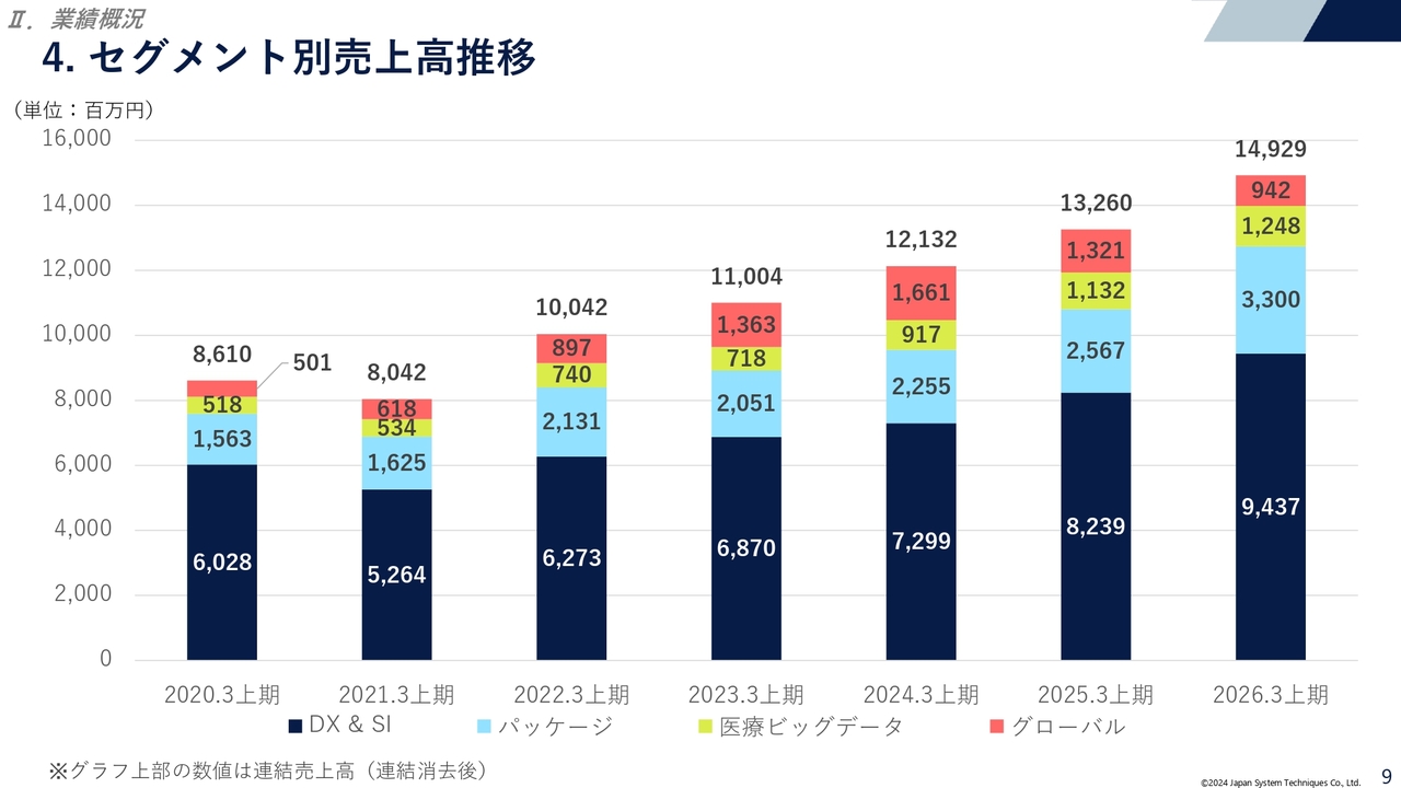 セグメント別売上高の推移です。DX&SI事業、パッケージ事業、医療ビッグデータ事業については冒頭でお伝えしたとおり、年々売上が拡大傾向にあり、順調に推移しています。