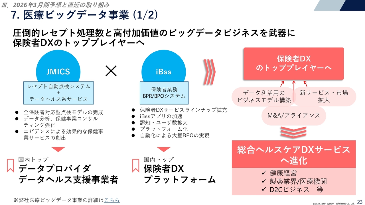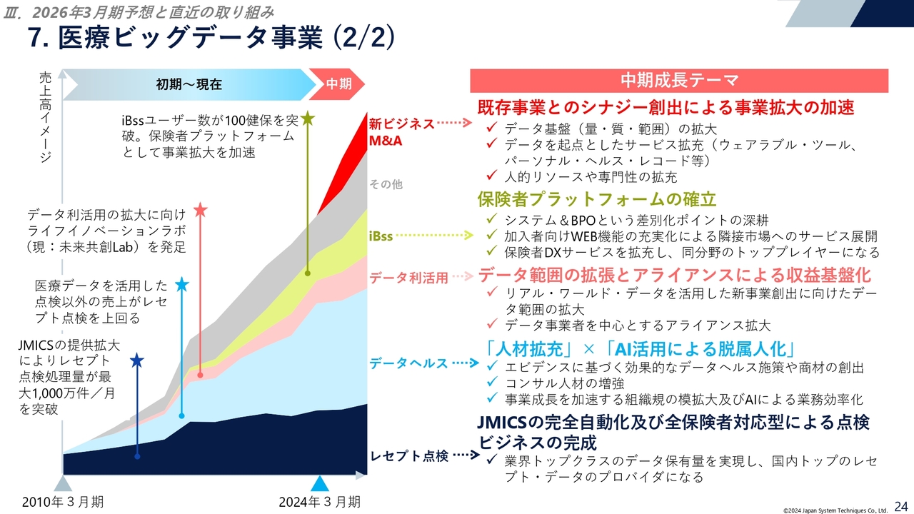 医療ビッグデータ事業は、15年前の2010年3月期からスタートしました。もともとはレセプト点検事業の「JMICS」のみでした。レセプト点検を続けることによってデータがビッグデータ化し、そのビッグデータを駆使していろいろなデータヘルス、データ利活用、「iBss」などの新しいサービスが発生的に生まれてきた流れがあります。