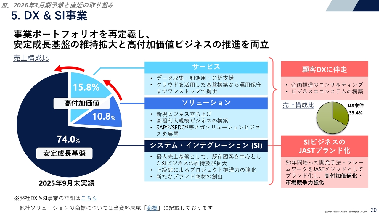 DX&SI事業では、事業ポートフォリオの見直しと再定義をこれまで掲げていました。システム・インテグレーション、従来からのSI事業については、いずれシュリンクしていくだろうという方向性は変えていないのですが、スライド左側の円グラフの比率をご覧いただくと、まだ比率が高い状況です。