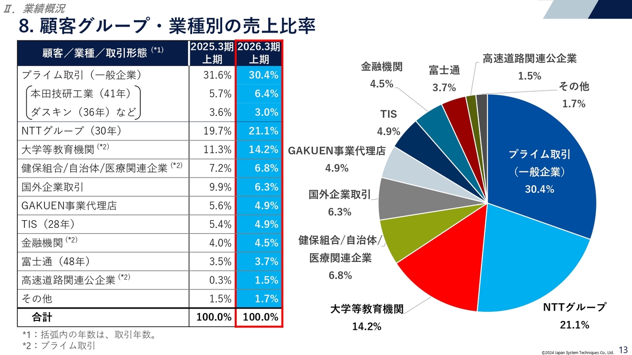 顧客グループ・業種別の売上比率です。スライドにはいつもの円グラフを記載していますが、売上比率順に展開しています。一番上がプライム取引です。括弧の中に取引年数を記載していますが、長年お取引をしていただいている本田技研工業さまやダスキンさまなどは、長期のプライム案件と捉えています。