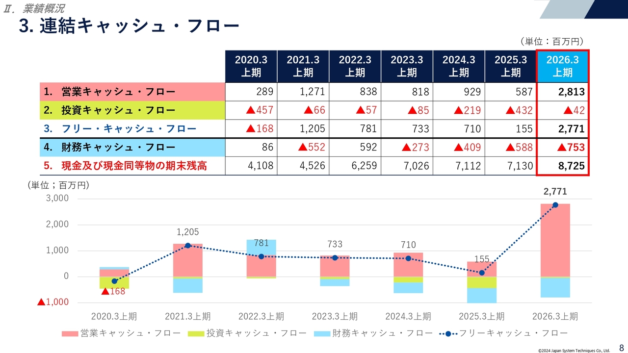 キャッシュ・フローです。営業キャッシュ・フローは、上期が約28億円と、過去の数字と比べると非常に大きな数字となっています。これは先ほどDX&SI事業のところでご説明したとおり、ここ数年長期の大型案件とプライム案件が増加傾向にあり、売掛債権を回収したことが今回の大きな数字につながっています。
