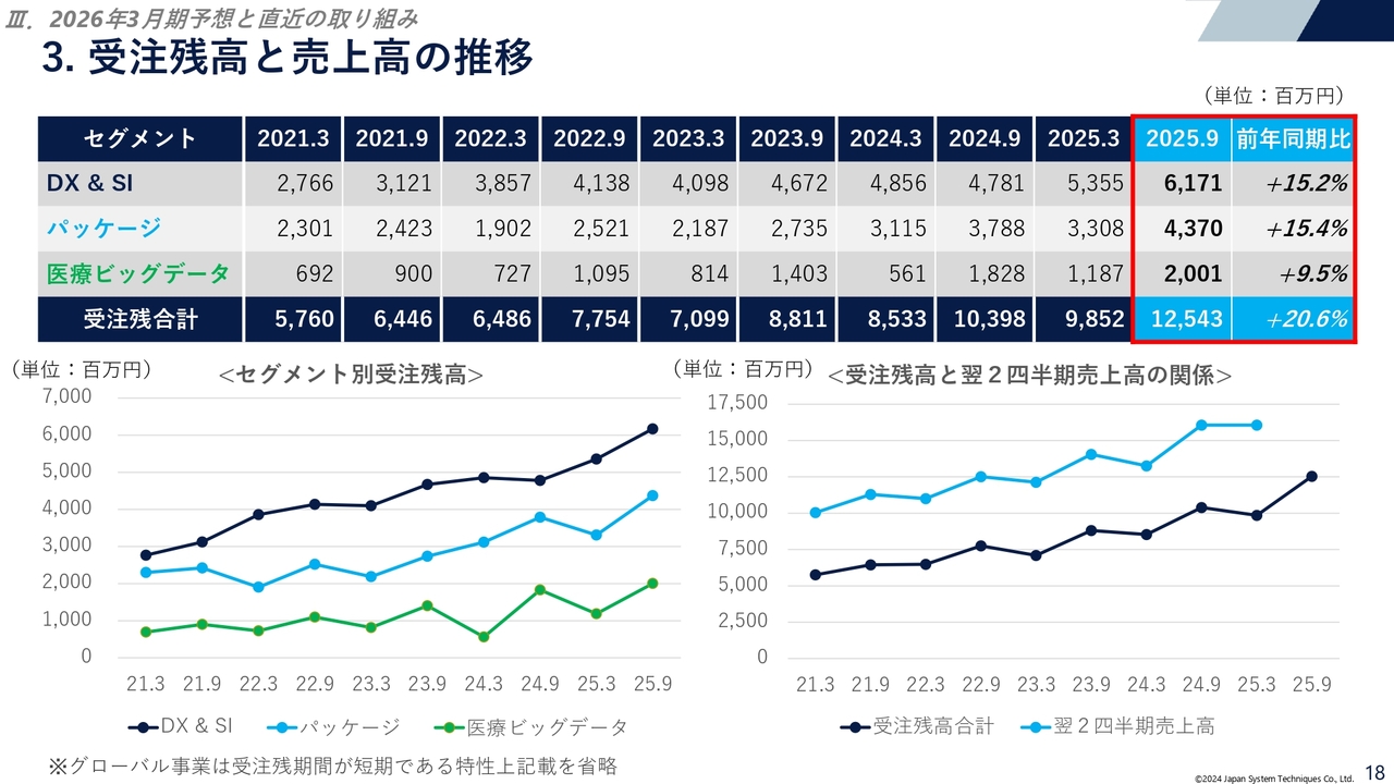 特にDX&SI事業は、これまでは3月末に受注残が売上に変わり減少し、上期の期中に再度受注残が積み上がる傾向がありました。しかしながら、長期の大型案件やプライム案件が増えてきたことで、3月期末も受注残が減らずに翌年度の上期にも受注残が膨れ上がっていく流れがあります。3月にも売上が伸び、営業キャッシュ・フローの増額にもつながっていますので、受注状況は良いと捉えています。
