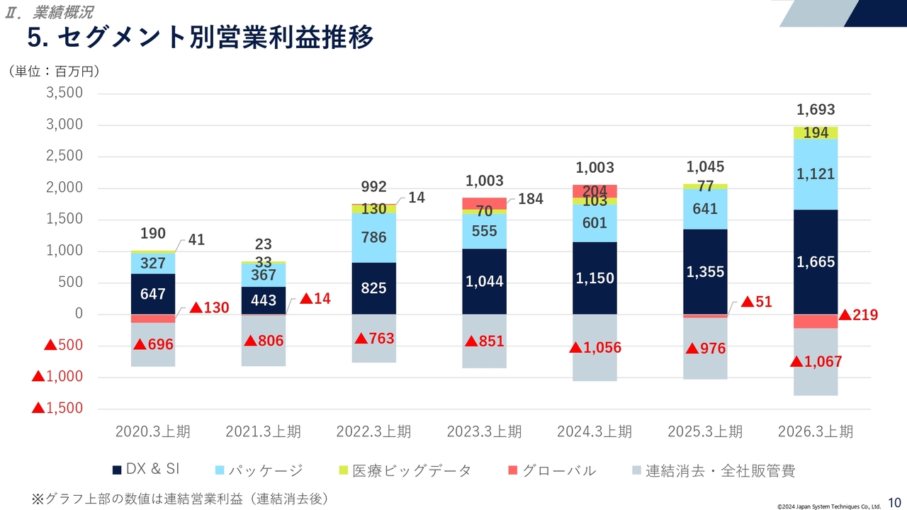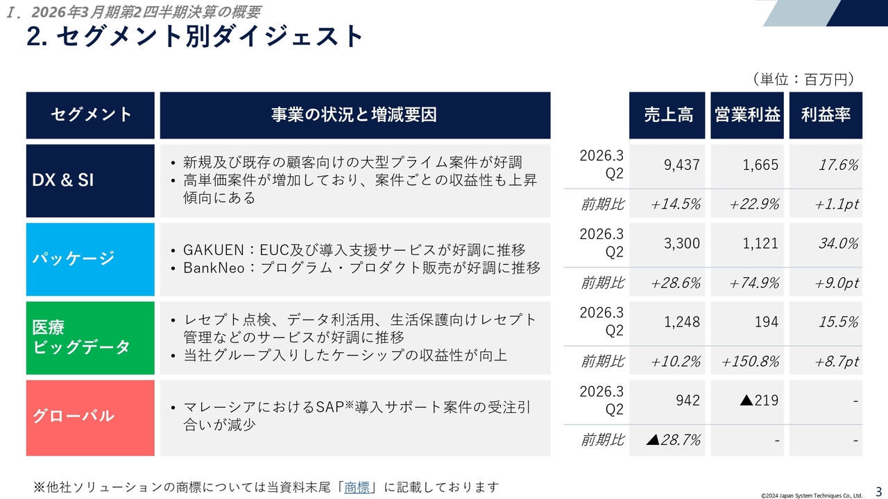 各セグメントについては、大まかに記載しています。次のスライドであらためてご説明しますが、DX&SI事業、自社ブランドのパッケージ事業、医療ビッグデータ事業の3事業が前年比で2桁の増収増益と堅調に推移しています。