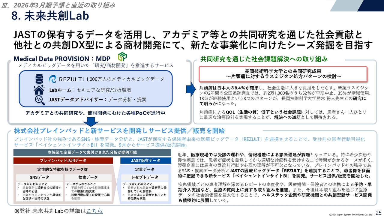 未来共創Labです。こちらは、変わらず医療ビッグデータを活用した大学や専門研究機関とのアライアンス等による共同研究を通じた健康増進、あるいは医療費削減に向けた社会貢献を目指しています。