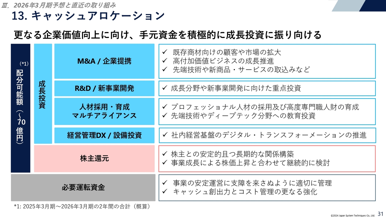 キャッシュアウト先行型の事業ですので、当然のことながら一番下の必要運転資金を最低限キープした上で、株主のみなさまに対する還元を差し引き、大体70億円弱が今考えている成長投資枠になります。