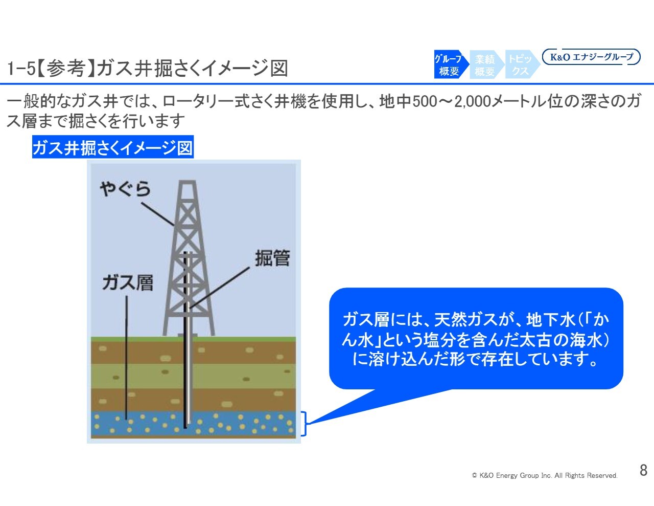 2,000メートルほど地下にあるガス層からガスをくみ上げますが、私どもが千葉県で掘削しているガスは、地下にある古代の海水に溶け込んだ状態となっています。