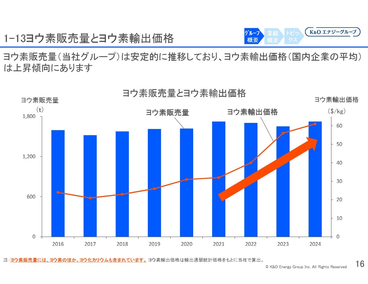 ヨウ素は約60ドルという高い価格で取引されていますが、国産ヨウ素の生産コストは変わらないため、私どもの業績向上に大きく貢献しています。