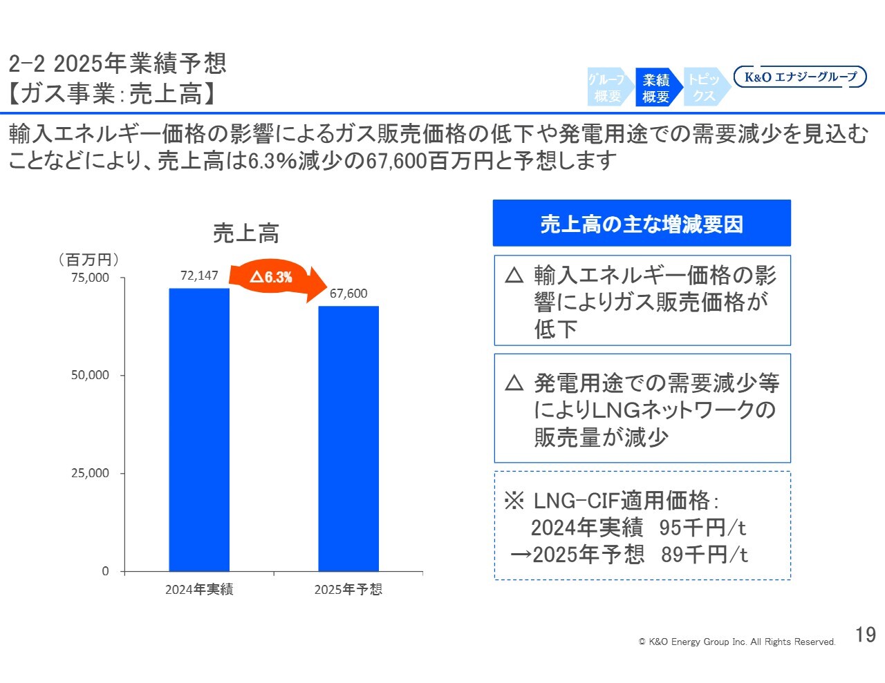 LNG-CIF価格については、2024年の実績は9万5,000円でしたが、今年は8万9,000円まで予想を引き下げたことで、売上高が減少する見込みとなっています。