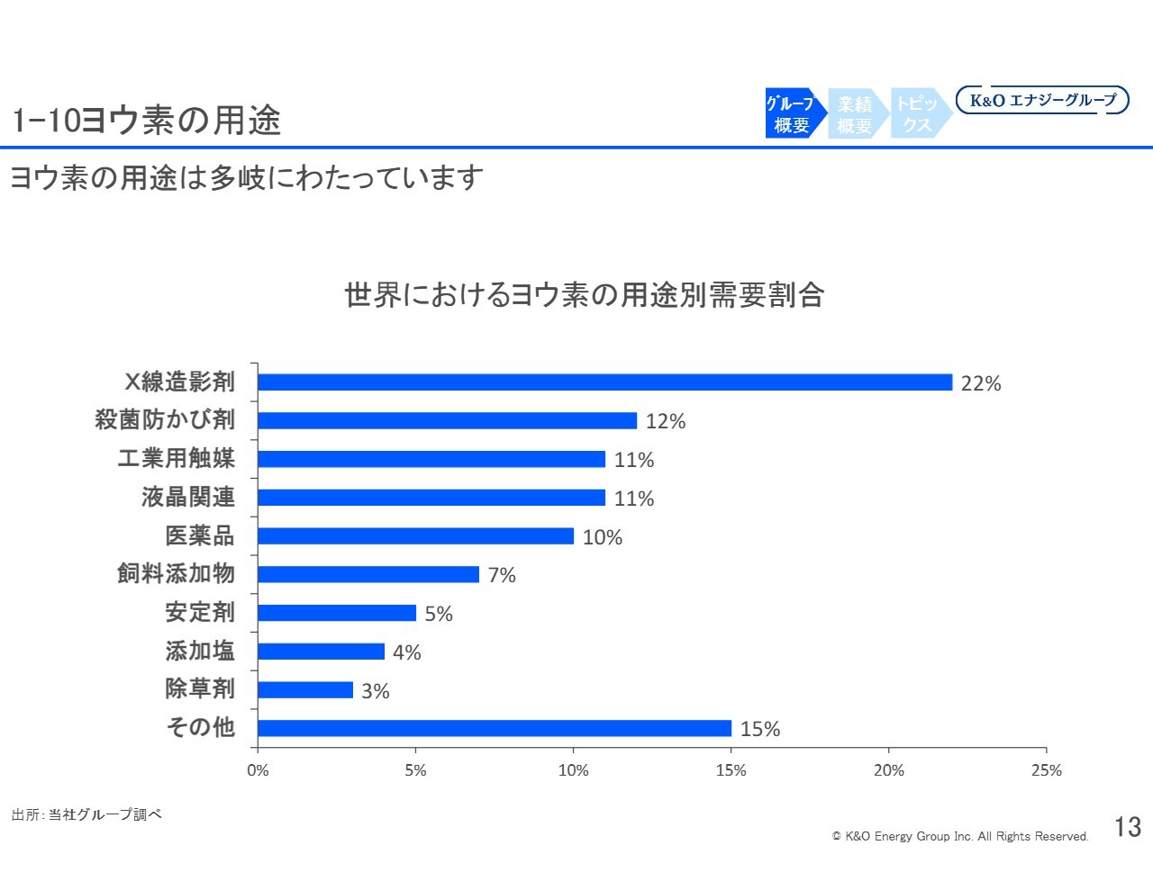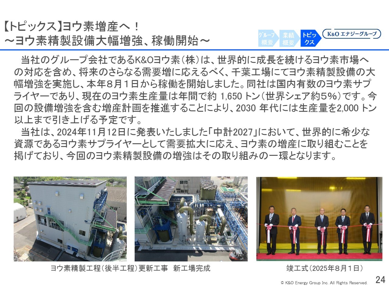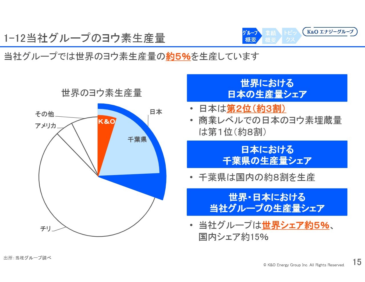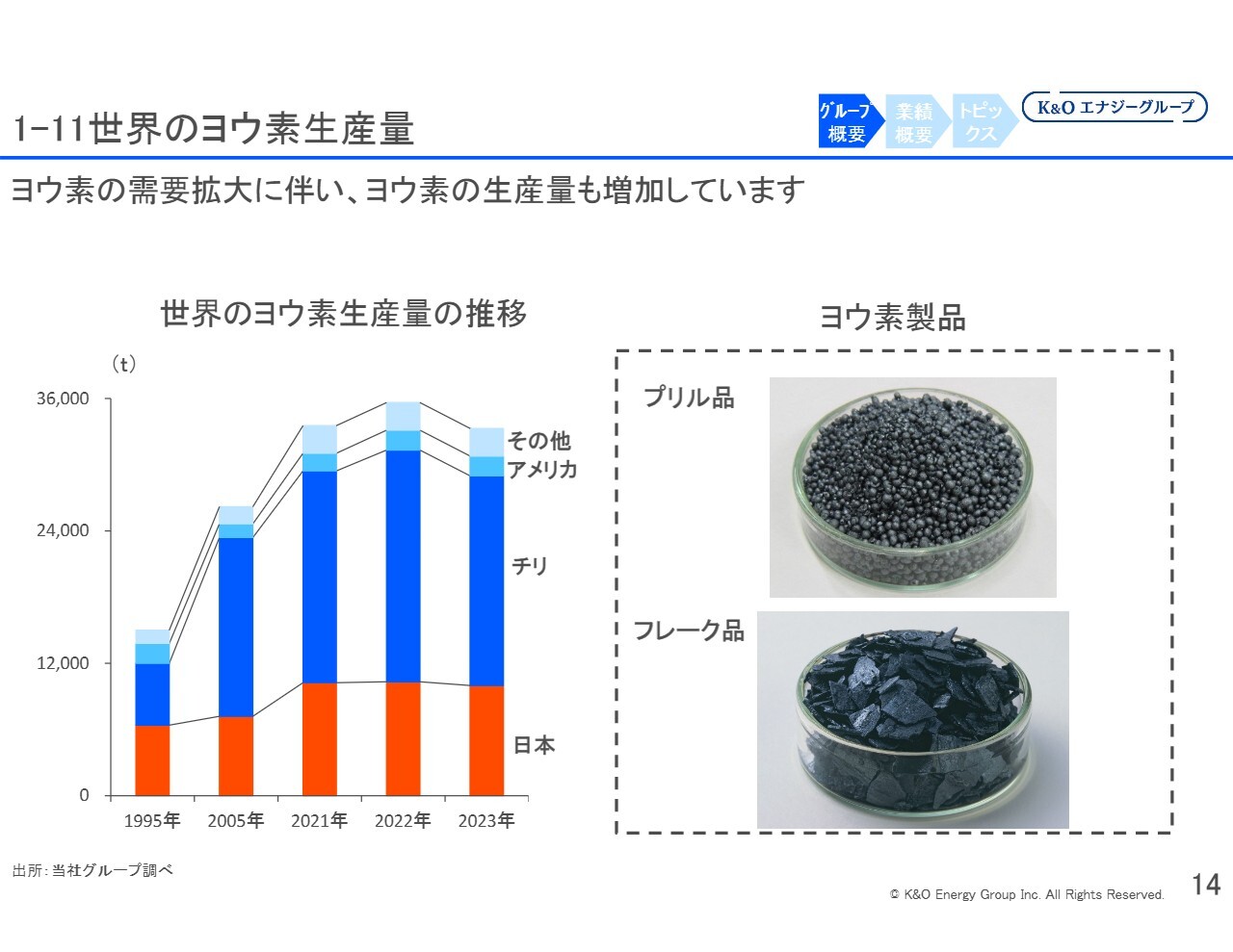 ヨウ素事業については、国内シェアが約15パーセント、世界シェアが約5パーセントです。世界的な需要は今後さらに拡大すると見込んでいます。年間2パーセントから3パーセントの需要増加が予想されており、それに伴い当社も年間2パーセントから3パーセントの供給量の増加が可能であると考えています。