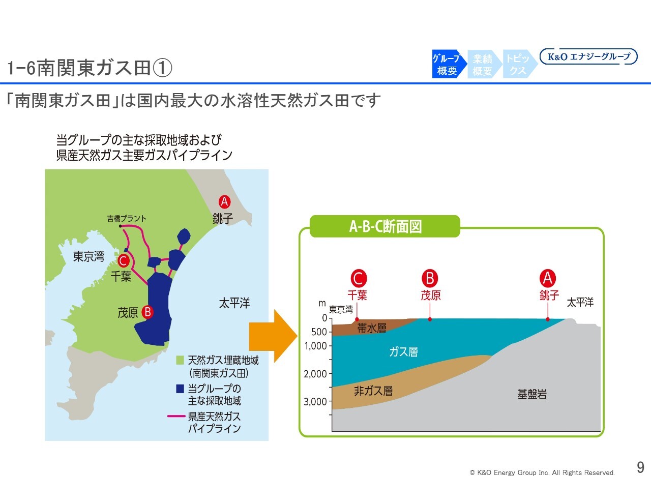ご覧のとおり、東京湾の西側、つまり東京都でも掘削するとガスが出てきます。ただし、スライド右側の断面図を見ると、「A」が銚子、「B」が当社の本社がある茂原、「C」が千葉ですので、ガス層は外房の太平洋側に近づくにつれて地上に近くなり、東京湾に近づくにつれてかなり深いところまで掘らないとならないことがわかります。