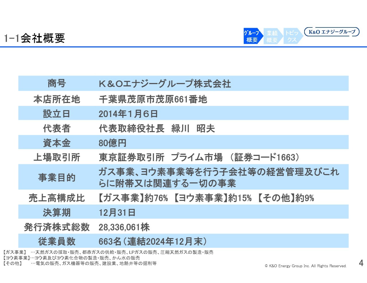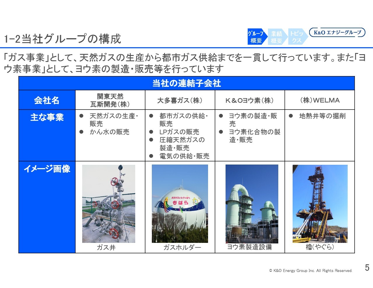 事業目的は、「ガス事業、ヨウ素事業等を行う子会社等の経営管理及びこれらに附帯又は関連する一切の事業」ということで、K&Oエナジーグループは事業会社を複数抱え、それらを統括する役割を担っています。