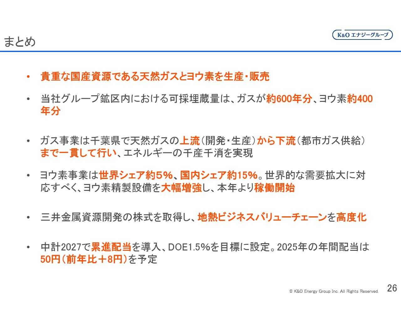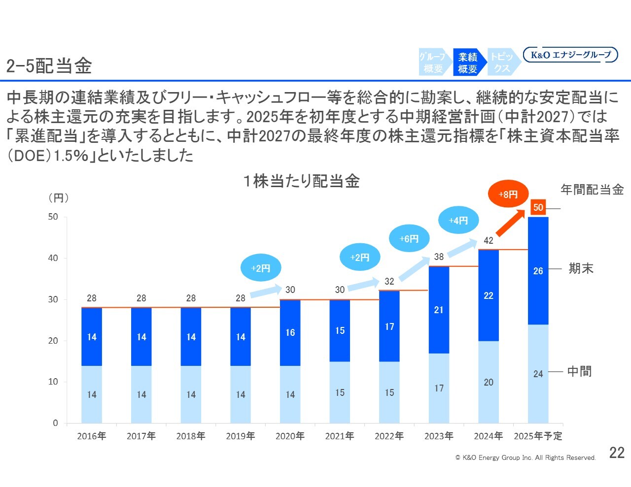 2025年の配当金は前期からプラス8円の50円とし、増配を予定しています。K&Oエナジーグループとなった2014年以降、配当を減らしたことは一度もありません。さらに遡り、関東天然瓦斯開発として上場していた時代も、配当を減らしたことはほとんどありませんでした。