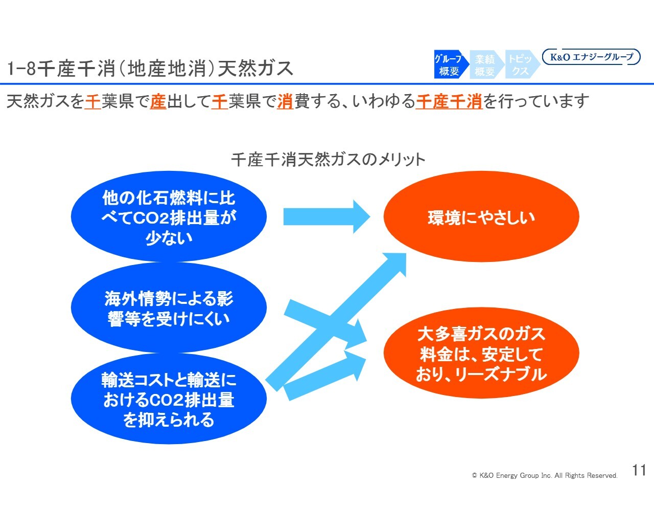 その後、スライドには記載していませんが、プロパンガス事業もいったん吸収し、大多喜ガスでは、都市ガス、プロパンガス、電気、さらに日本ではおそらく当社だけが手掛けている圧縮天然ガスの販売事業も展開しています。このように、家庭などで使用するエネルギー全体を販売する体制を構築してきています。
