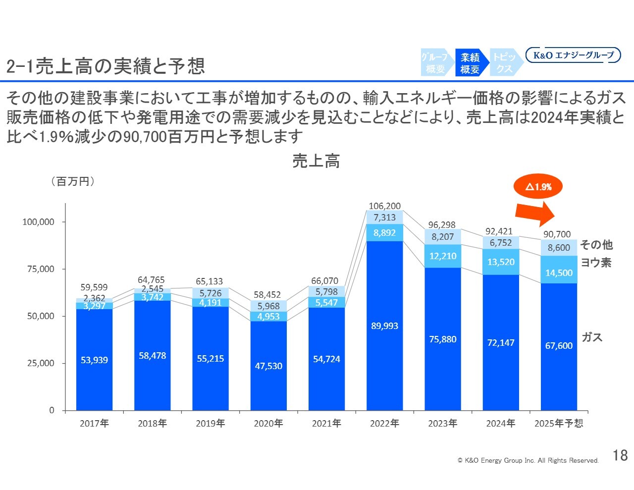 緑川:ガス事業の2024年の実績および2025年12月末までの売上高の見込みです。売上高は前期比6.3パーセント減少すると予測しています。主な増減要因については、スライド右側に記載のとおり、輸入エネルギー価格の影響が最も大きいです。