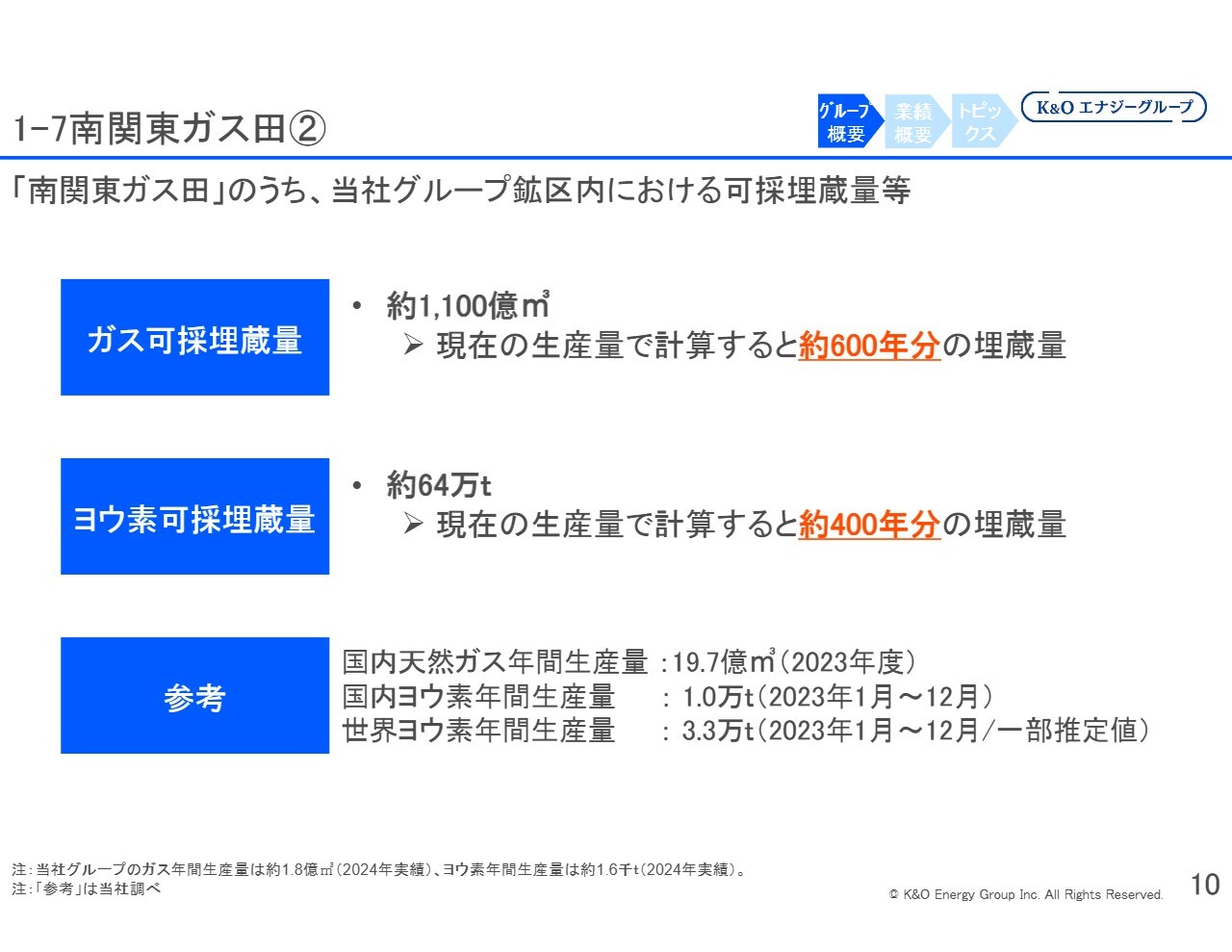 緑川:まとめると、当社は貴重な国産資源である天然ガスとヨウ素を生産・販売しています。当社グループの鉱区内の可採埋蔵量は、ガスが約600年分、ヨウ素が約400年分といった十分な量を有しています。