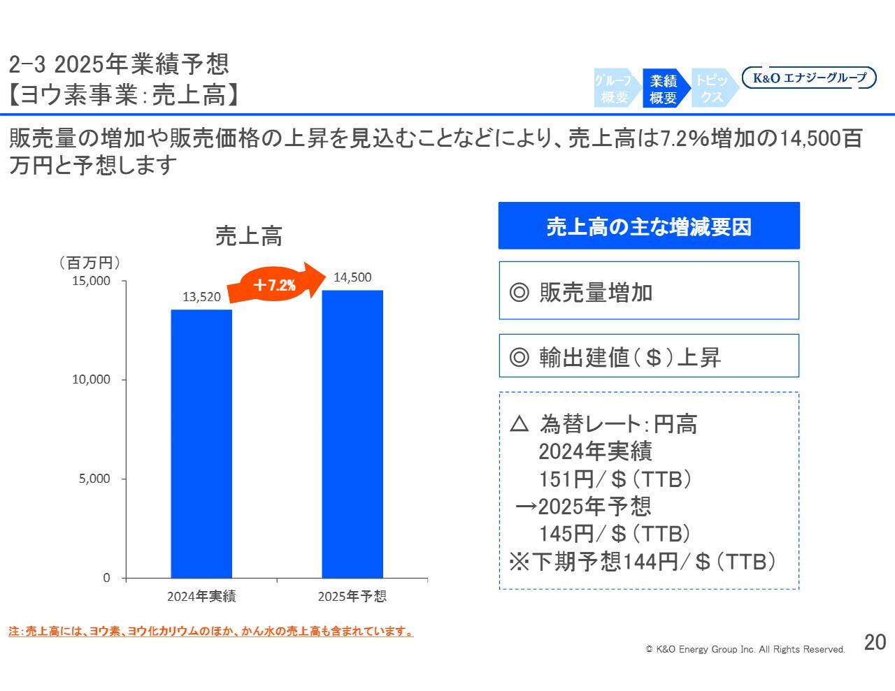 緑川:ヨウ素事業は、売上高と販売量が増加し、輸出の建値もさらに上昇すると予想しています。ただし、為替レートについては、今年の予想を1ドル145円と見ていますが、現在は150円を上回る円安に振れており、さらに円安が進む可能性もあると考えています。
