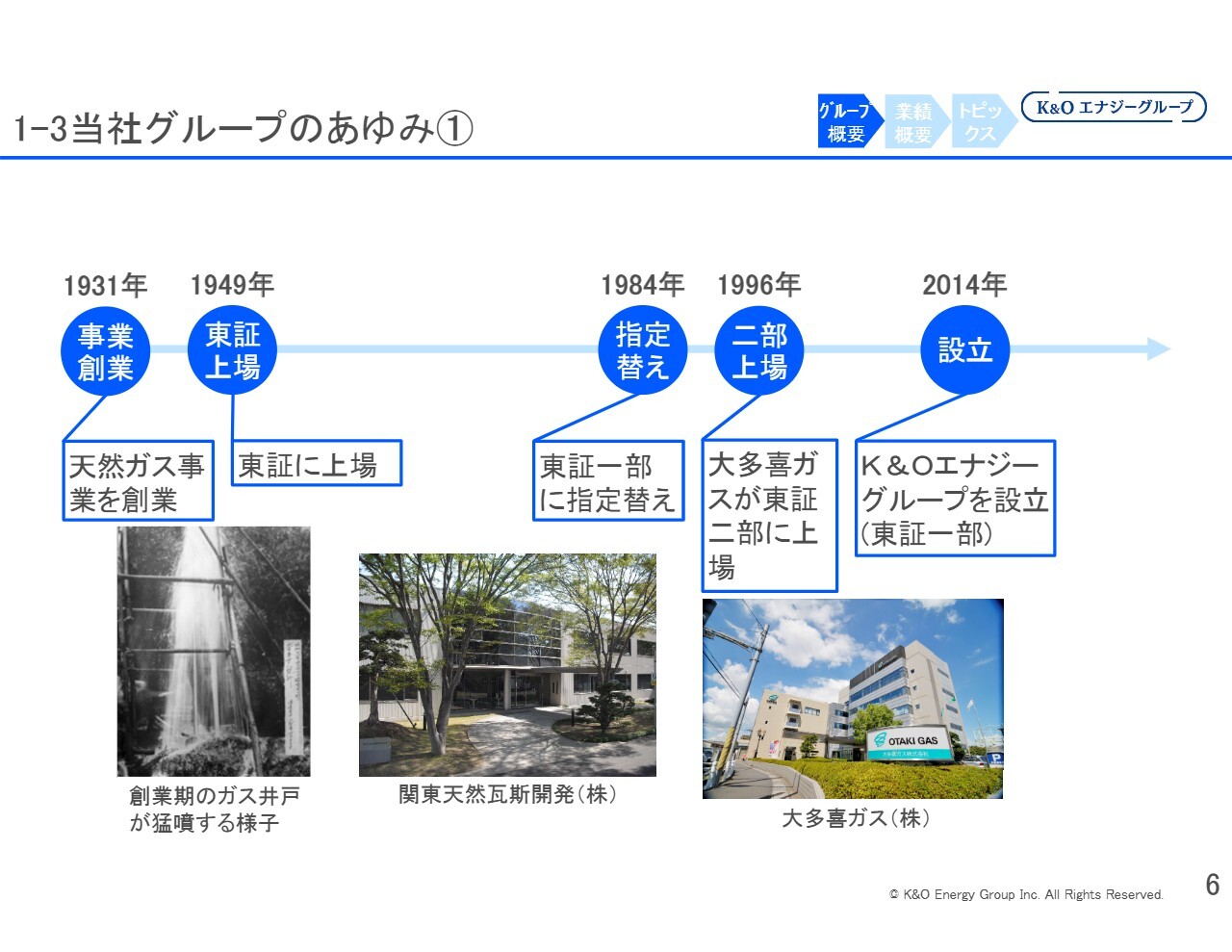 戦前に天然ガス事業を開始し、1949年に東京証券取引所に上場後、1984年に東証一部に指定替えしました。その間に、関東天然瓦斯開発と大多喜ガスという生産と販売の会社に分かれています。関東天然瓦斯開発を親会社として東証一部に上場し、その後、子会社である大多喜ガスが1996年に東証二部に上場しました。