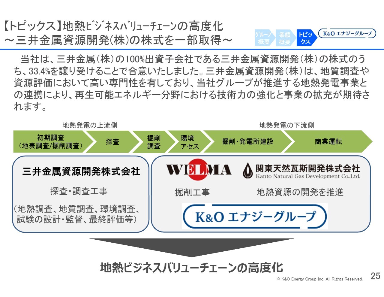 また、三井金属資源開発さまの株式を取得したことにより、地熱に関するビジネスバリューチェーンについては、一気通貫で開発できる体制が整いました。