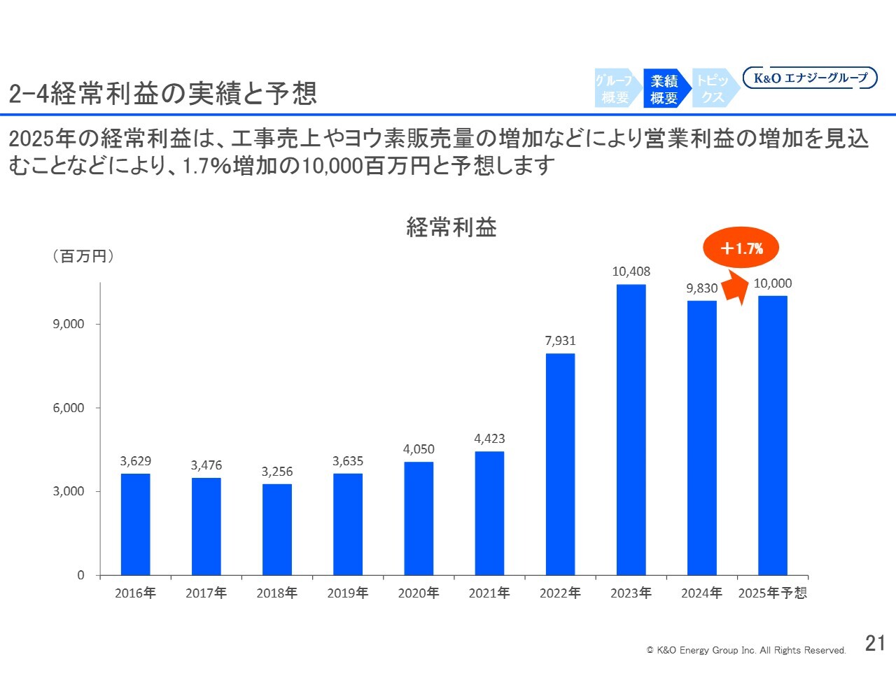 緑川:経常利益については、2022年から2025年にかけて増加しています。ヨウ素売上高の増加が大きな要因であり、ここ数年の利益水準を支えています。