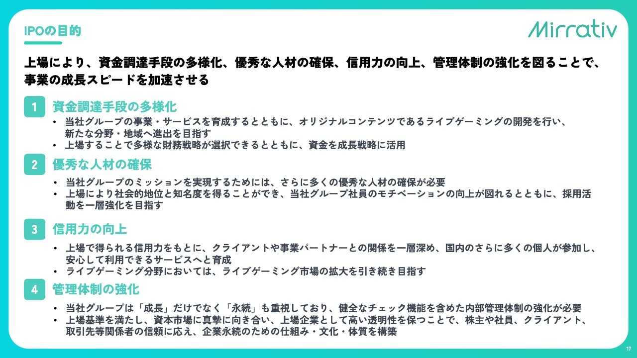 また、スライドに記載したとおり、IPOによって広がる各種経営オプションがあると思っています。また採用を含めた競争力の強化ももちろん考えています。